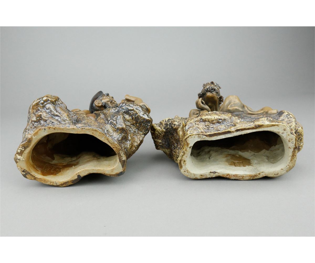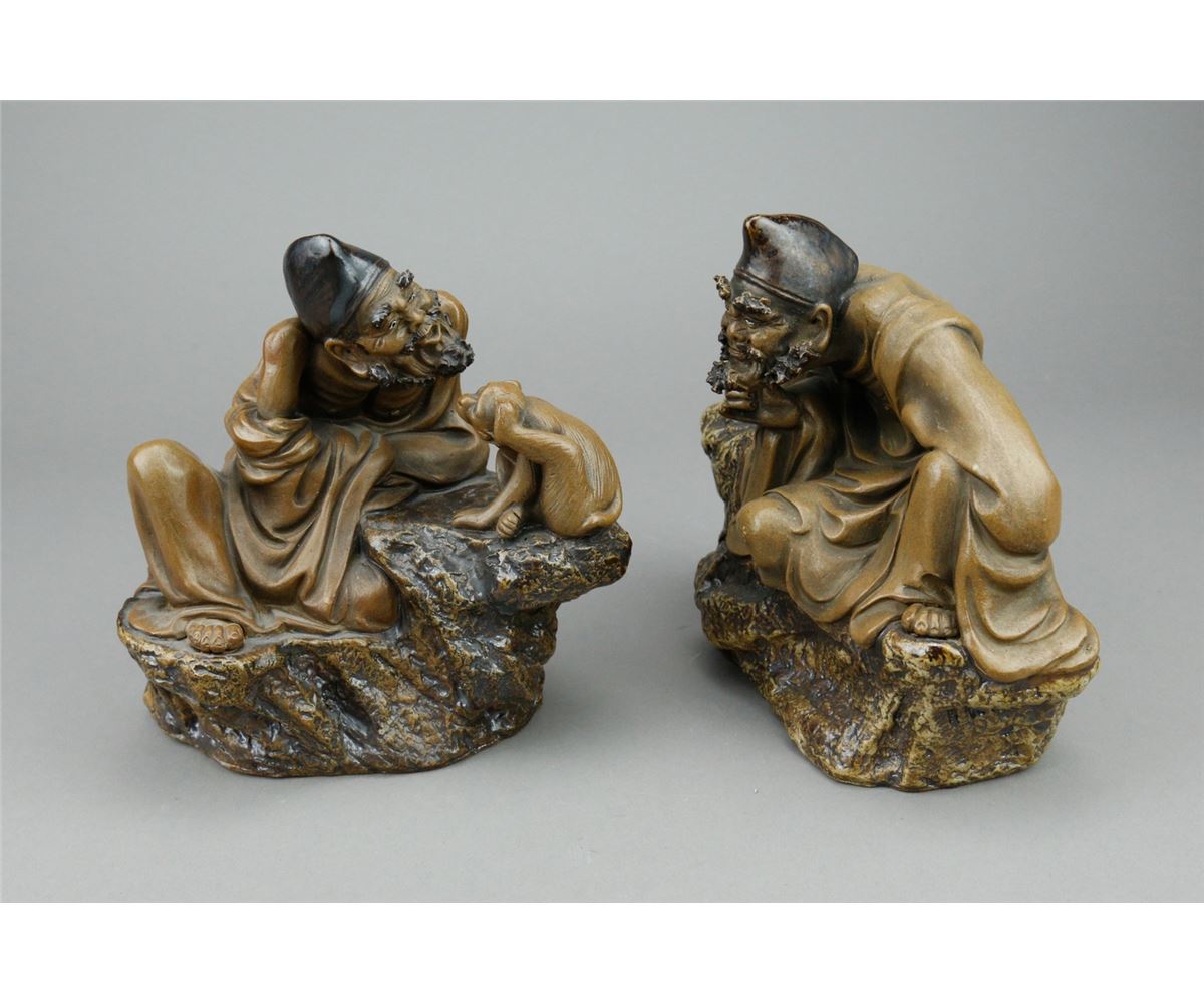 Pair of Chinese Ji Gong porcelain figures; depicting Ji Gong in conversation with a monkey; of various brown tone; hollowed inside; artist seal on base; H: 15.5 cm, W: 18 cm, 1926 grams
