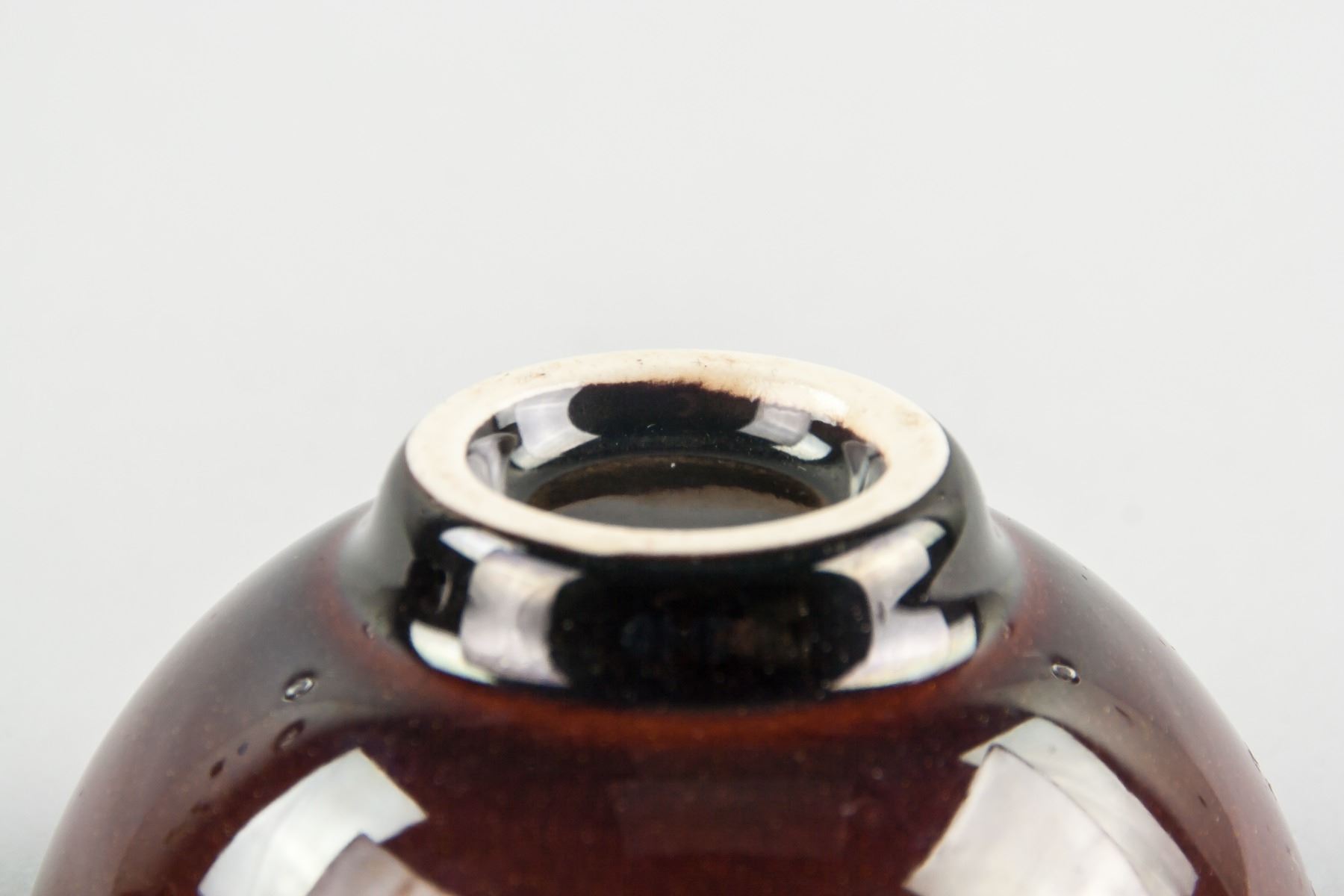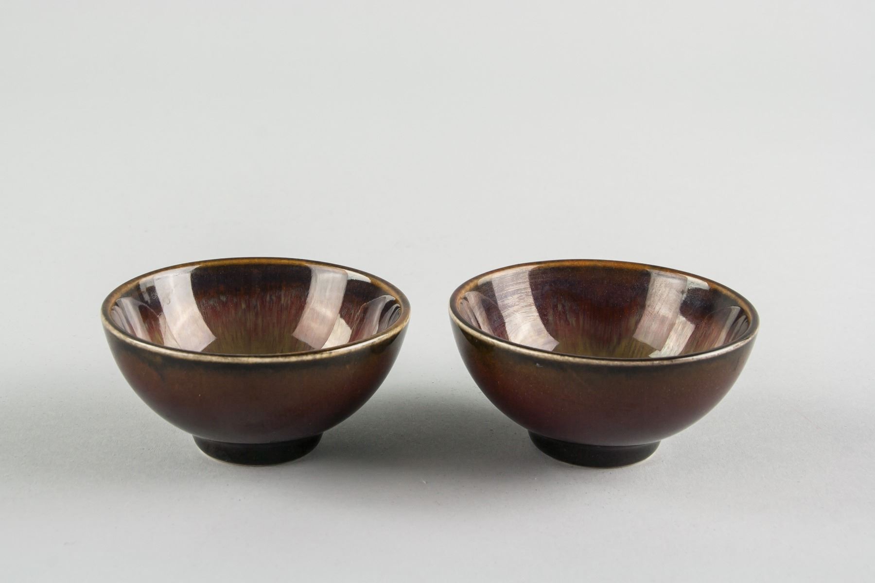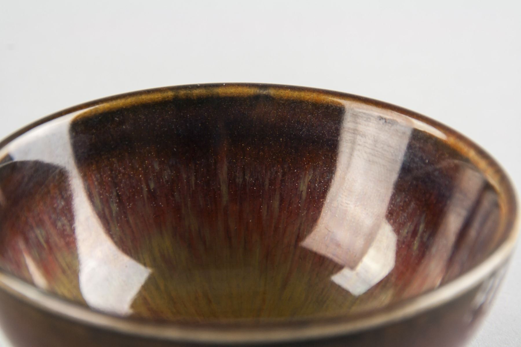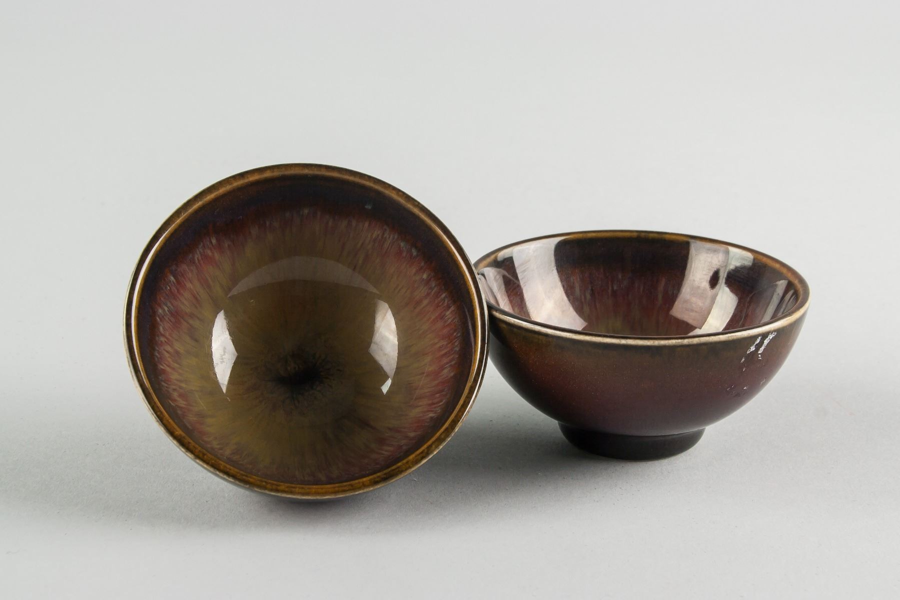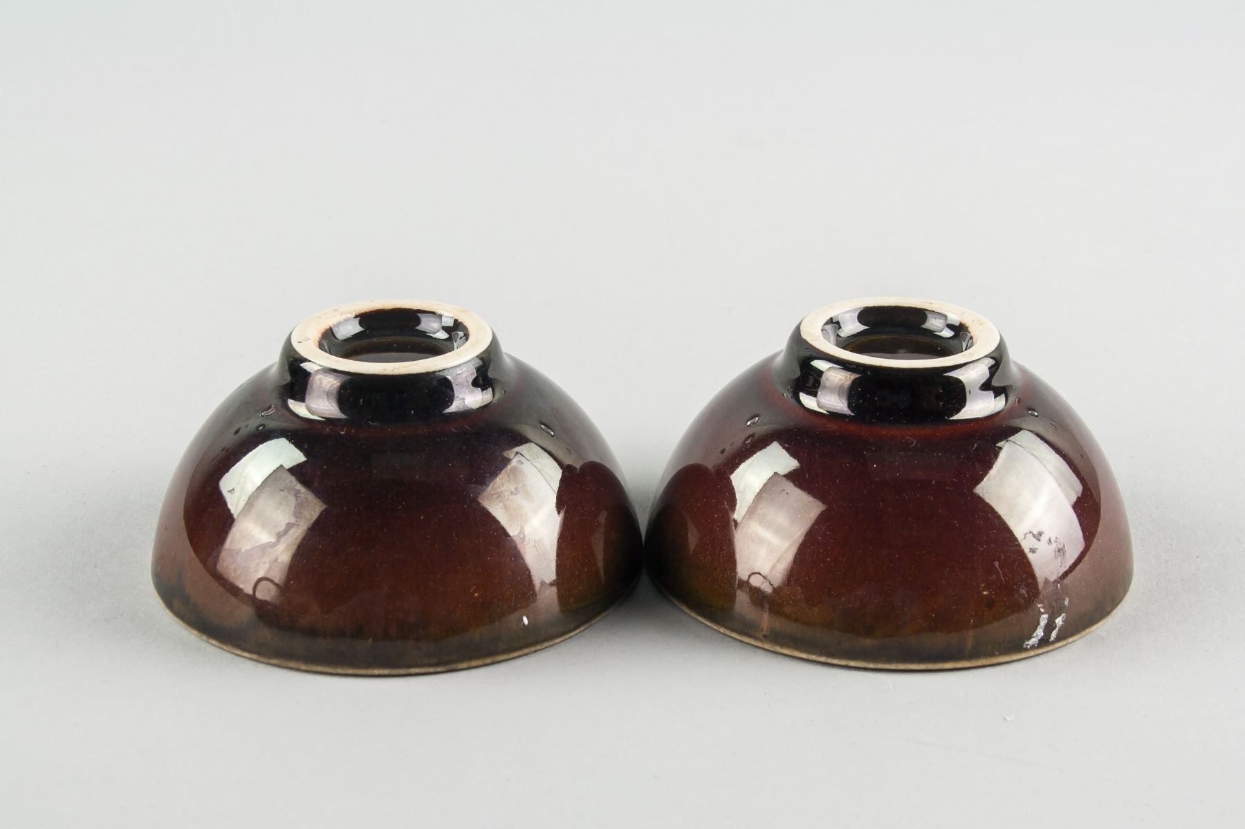 Pair of Chinese Junyao style porcelain cups; supported on short foot rim; of dark brown flambe glaze; H: 4 cm, D: 8 cm, 154 grams total