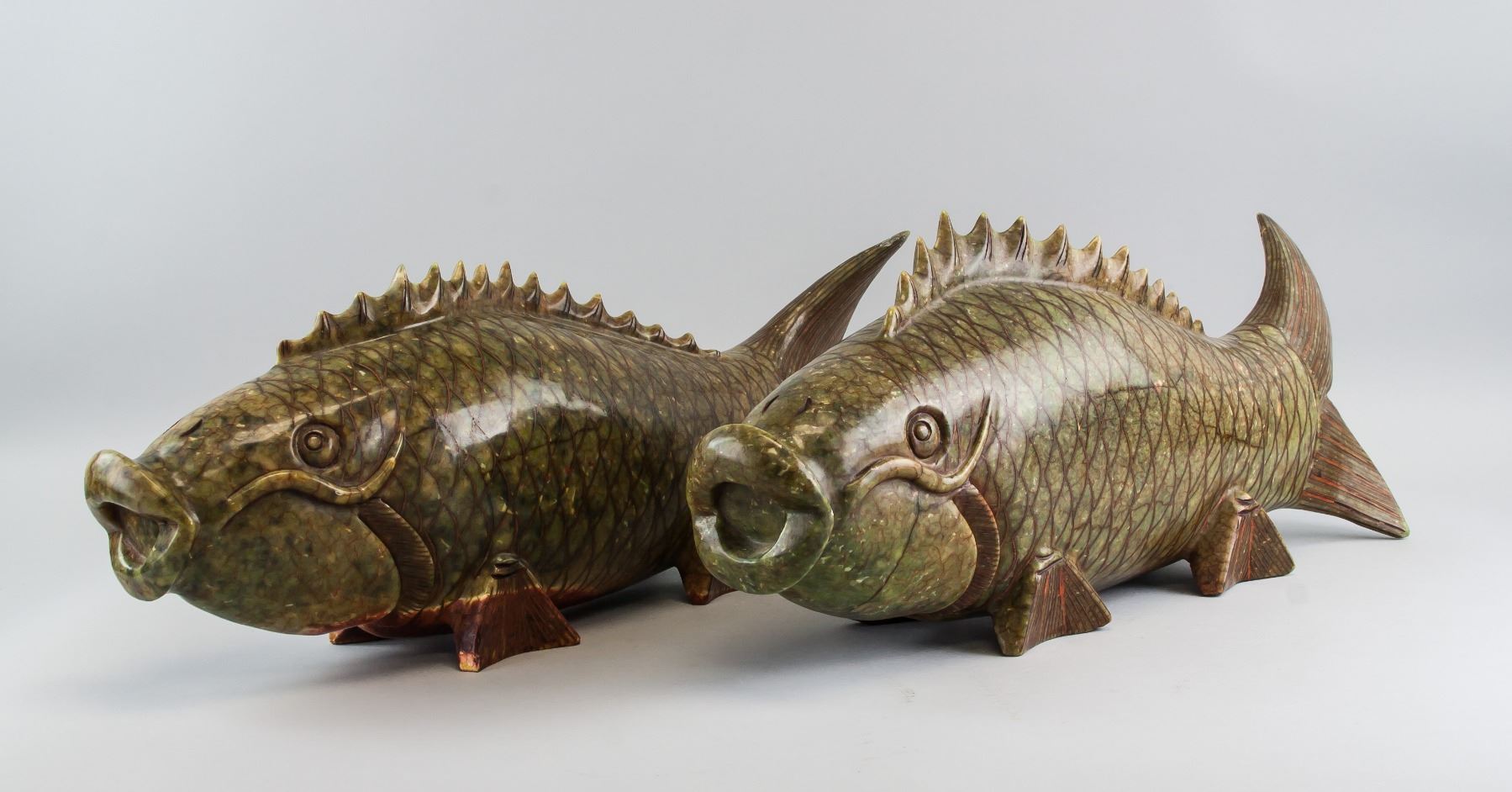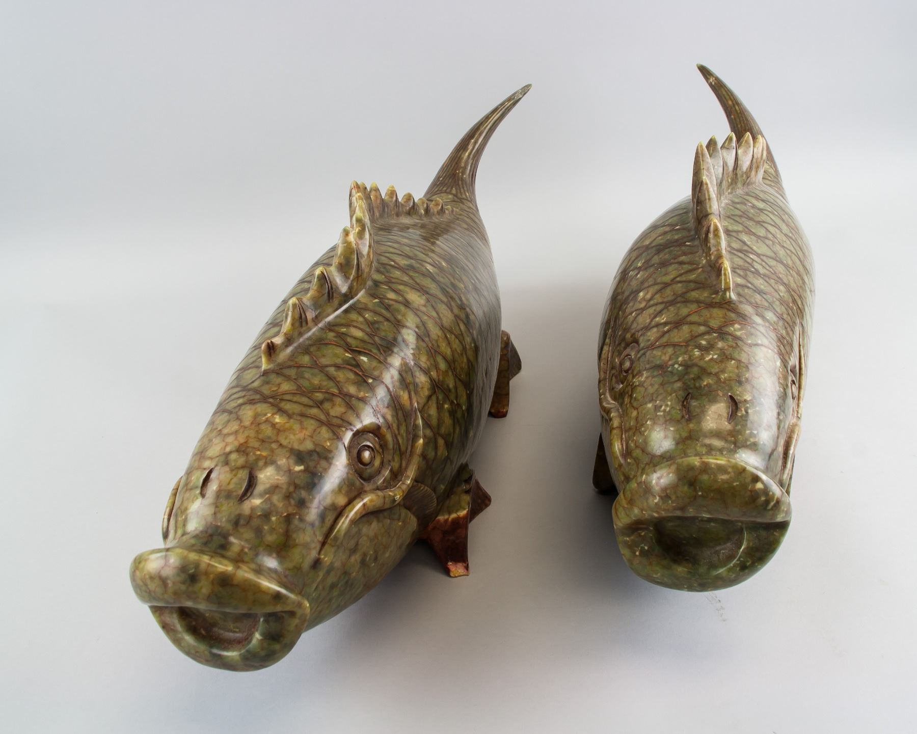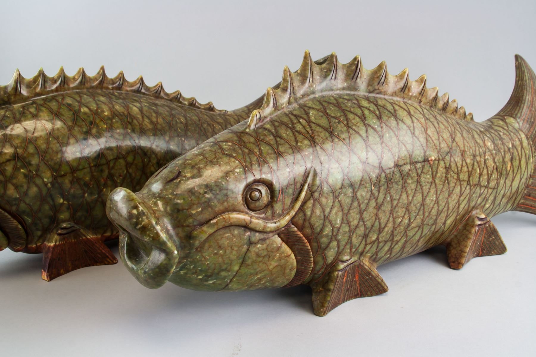 Pair of Chinese stone carved large fish; carved in swimming carp form; of mixed dark green and brown tone; 23 cm x 63 cm, 20 kilograms