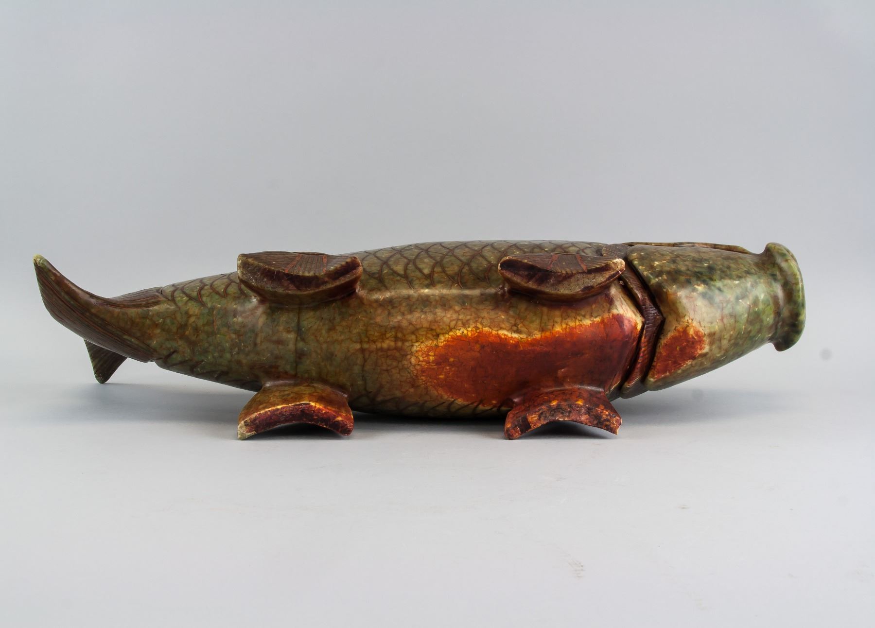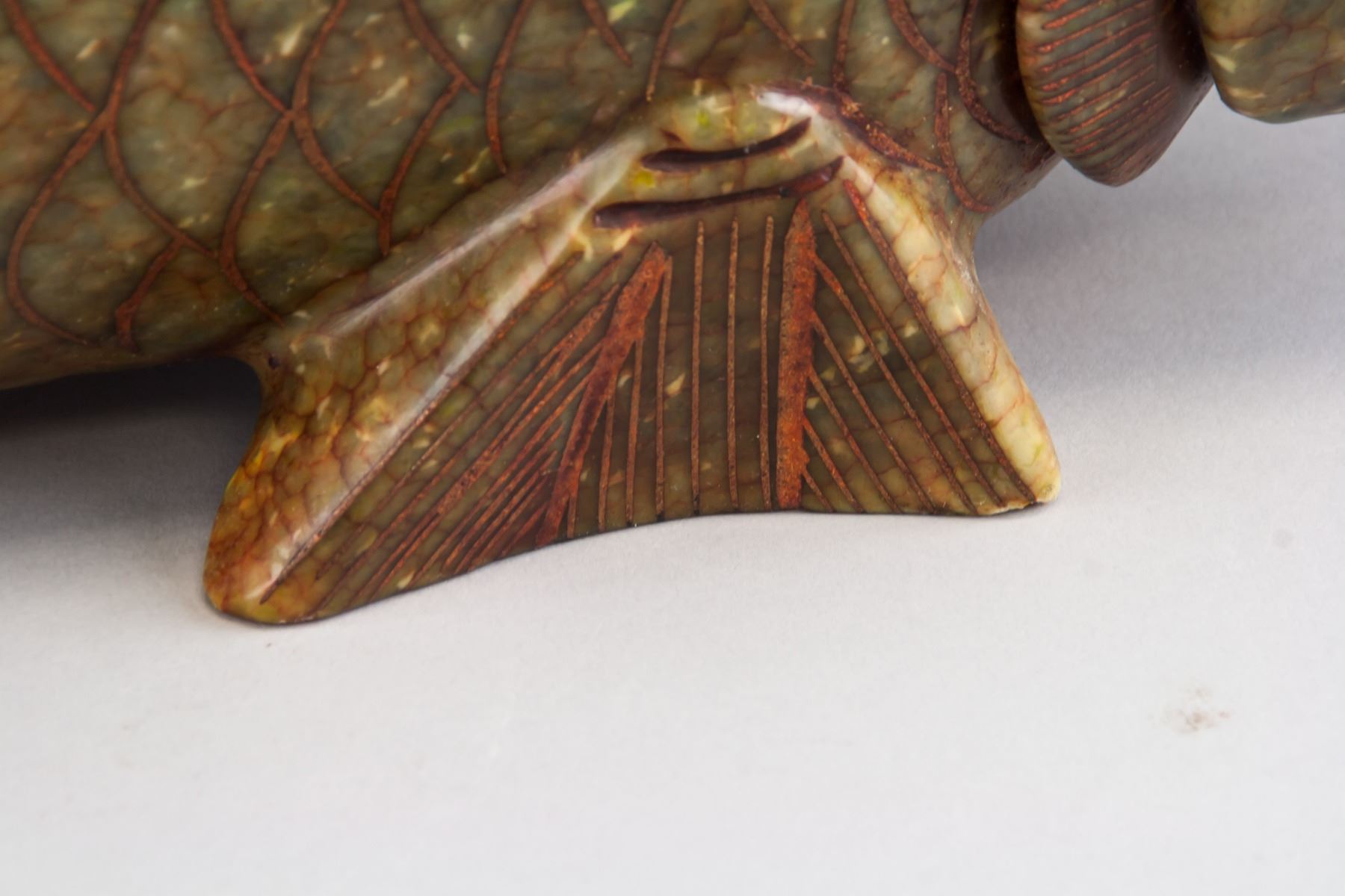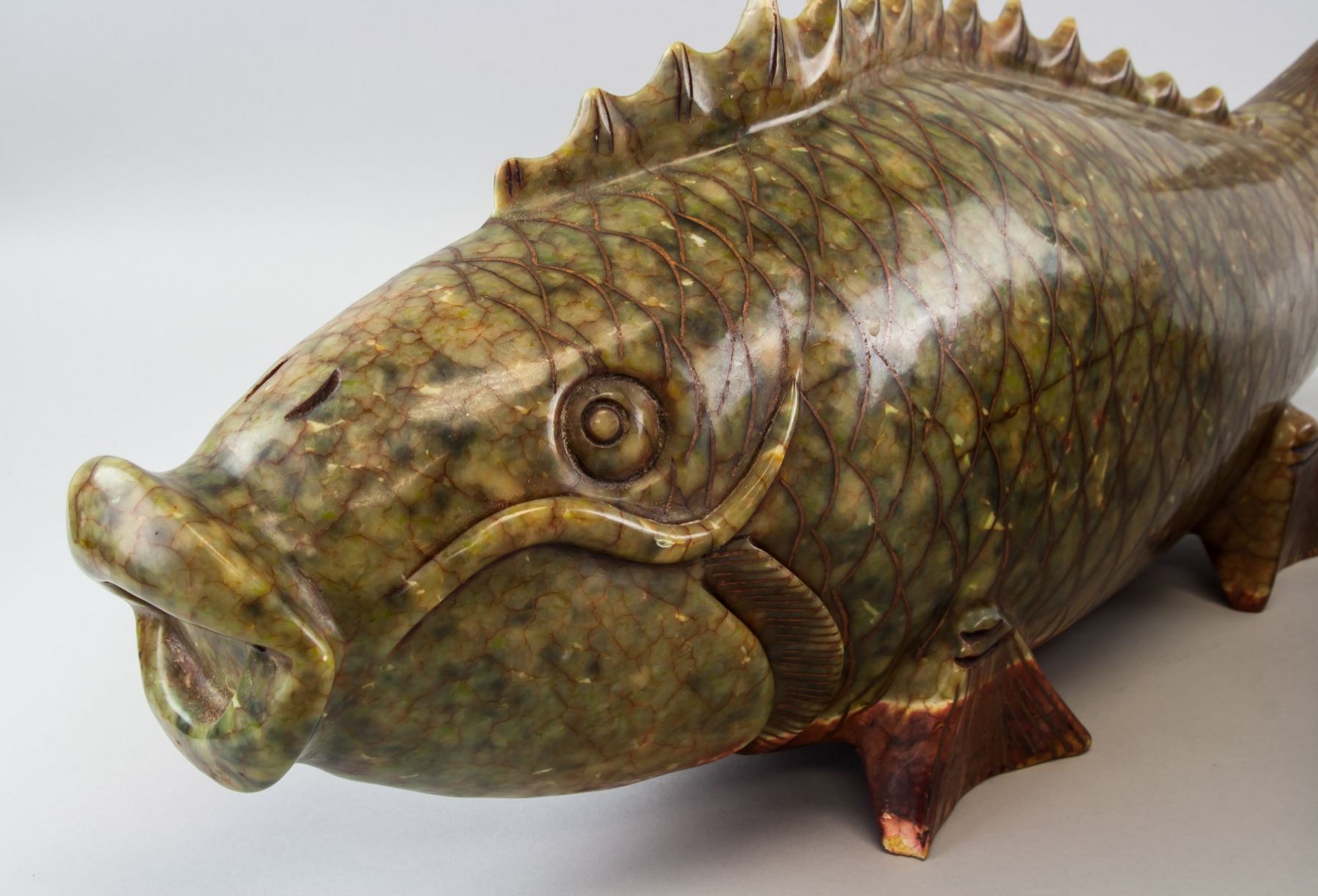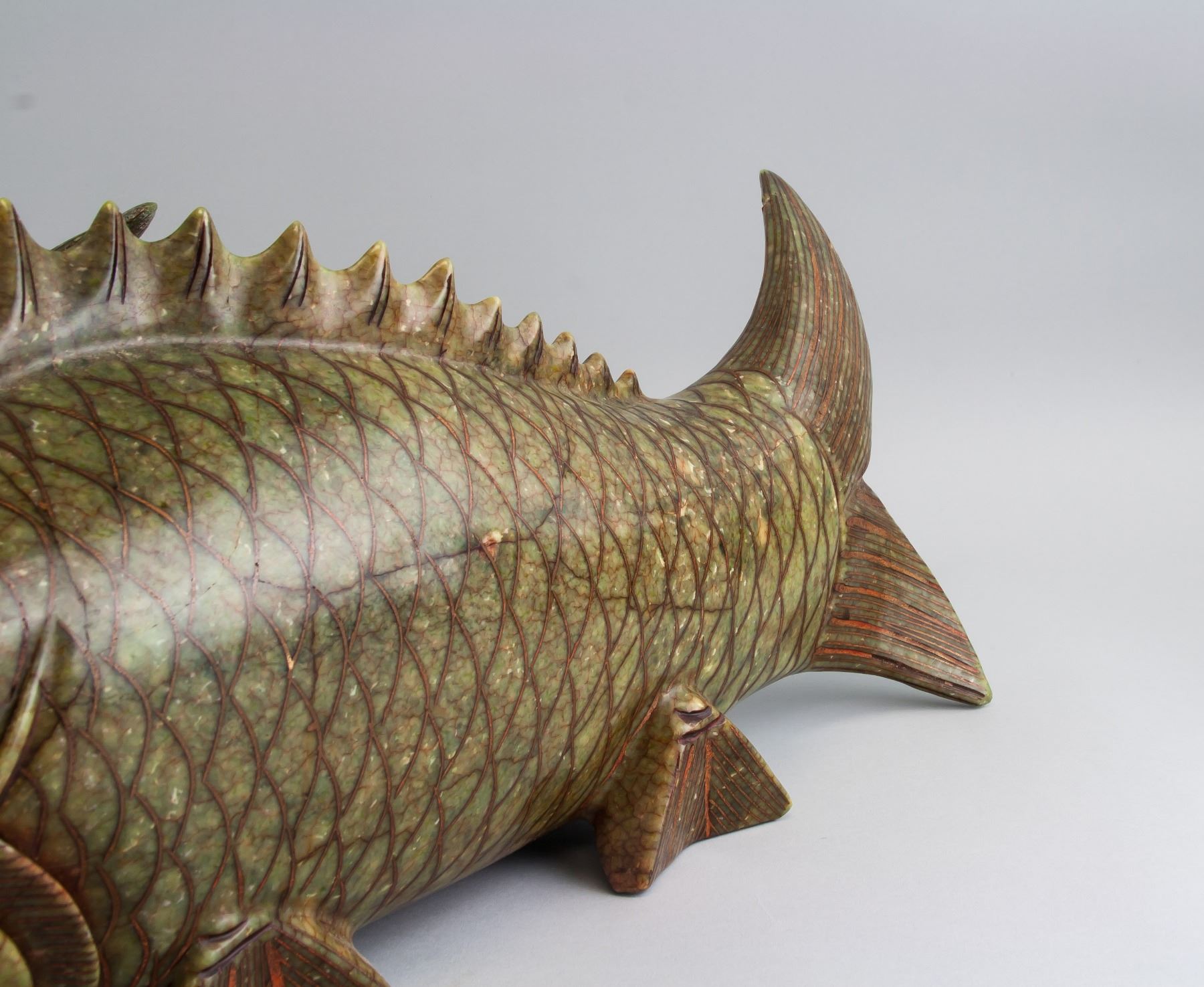 Pair of Chinese stone carved large fish; carved in swimming carp form; of mixed dark green and brown tone; 23 cm x 63 cm, 20 kilograms