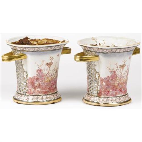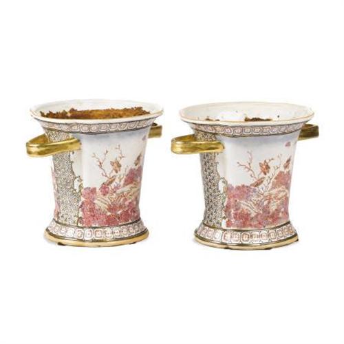 <B>Pair of Chinese Porcelain Vases<BR></B></I>Unknown maker<BR>Nineteenth/Twentieth Century<BR>The pair of Chinese porcelain vases of shaped, waisted form with double gilt handles, the body with designs of birds in a landscape flanked by a border above and below<BR>Red chop mark to the underside<BR>7 inches high x 7.2 inches wide<BR><BR><b>Shipping:</b> Requires 3rd Party Shipping (<a target="_blank" href="http://www.heritageauctions.com/common/shipping.php">view shipping information</a>)