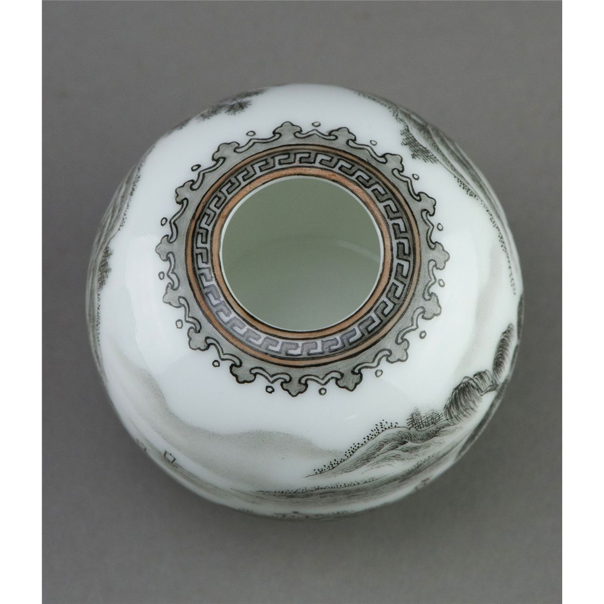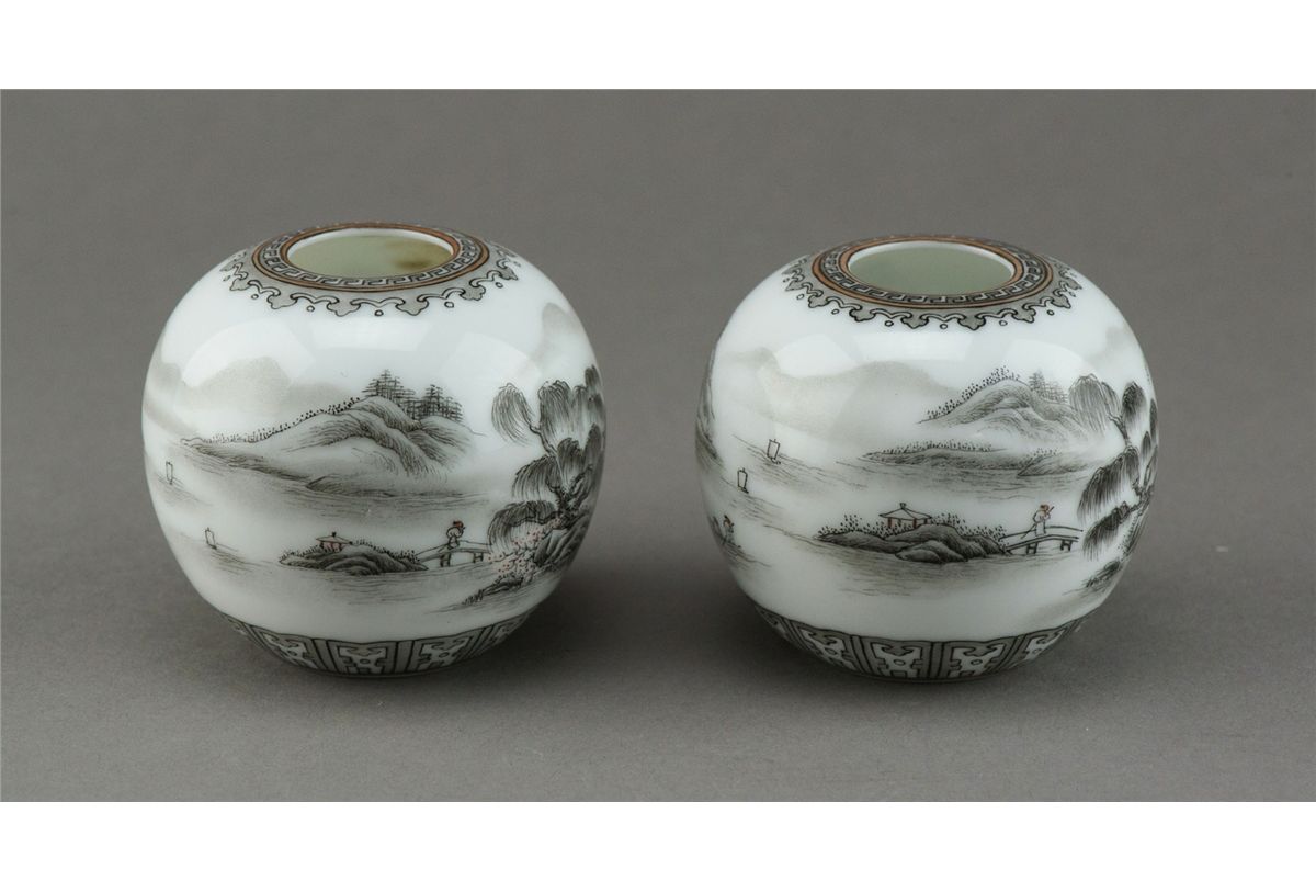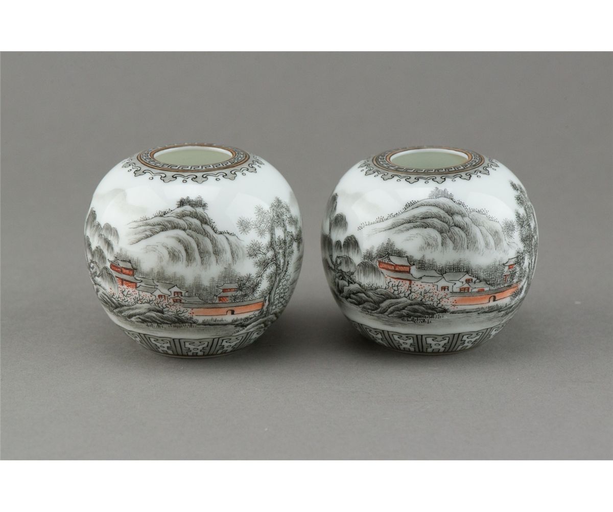 Pair of Chinese porcelain water pots, of globular shapes, painted continuous landscape, Daoguang mark on base; H: 5.5 cm, D: 6 cm, 50 grams each; provenance; Ma Collection Toronto
