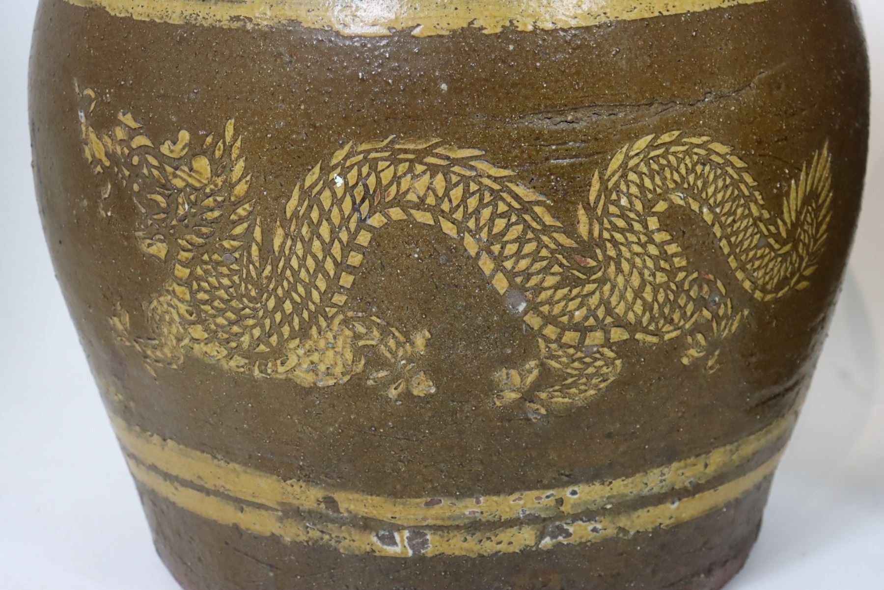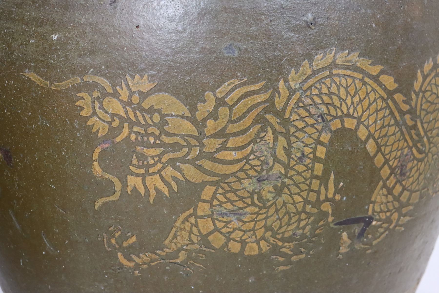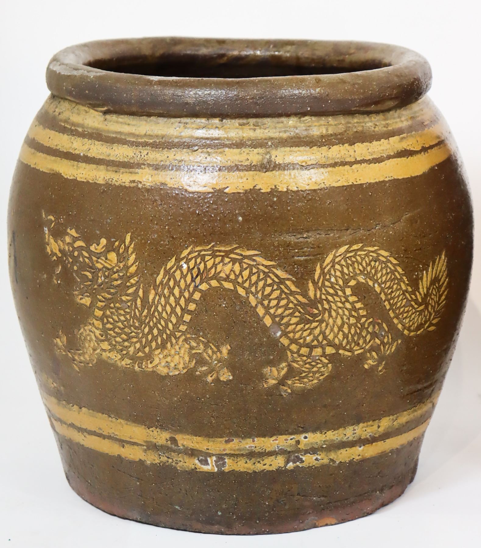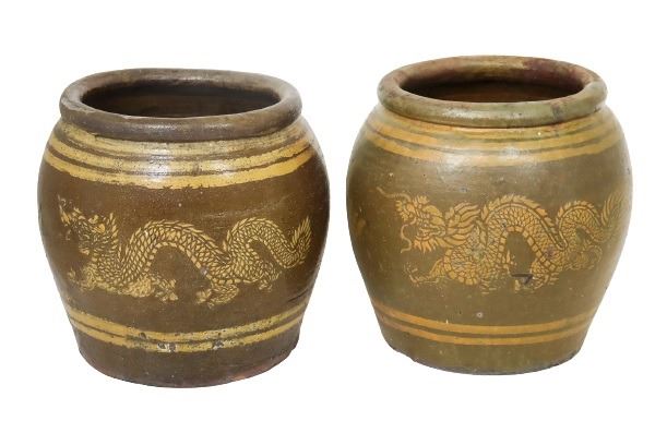 Pair of heavy pots, with Chinese Dragons in the center detailing. Size: 18 x 18 in.