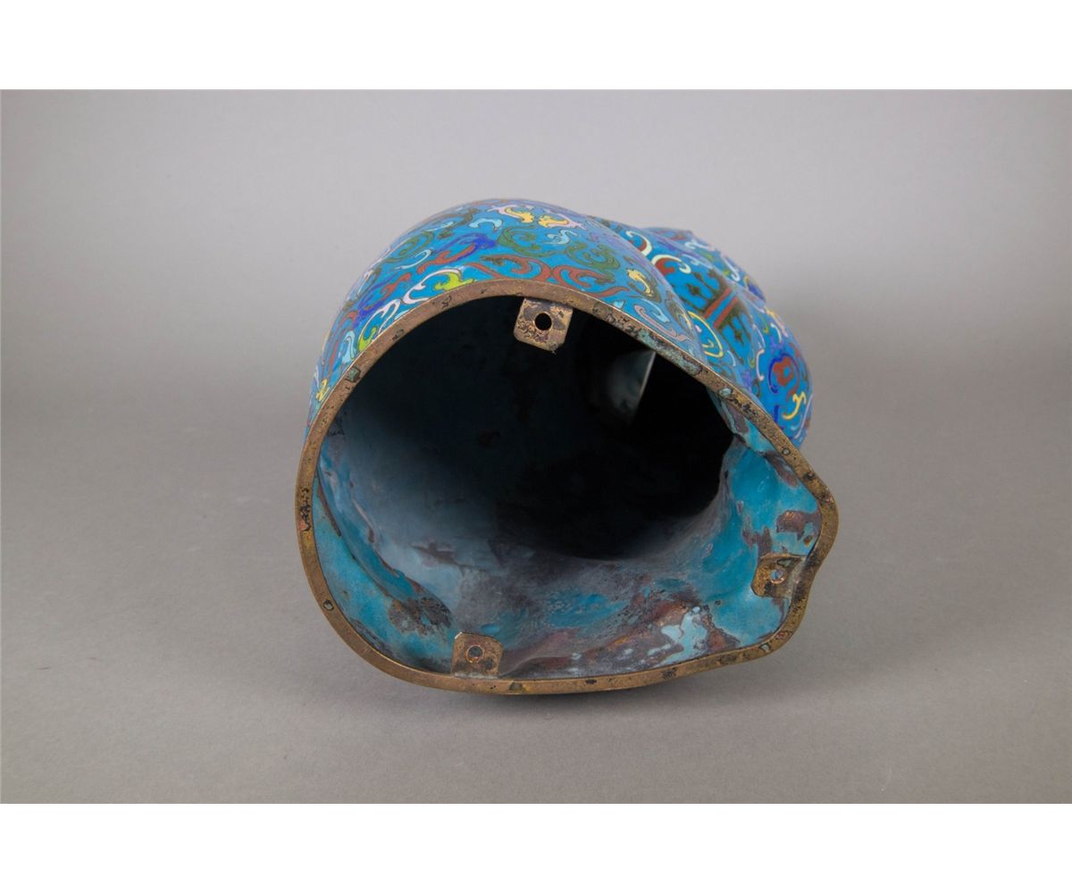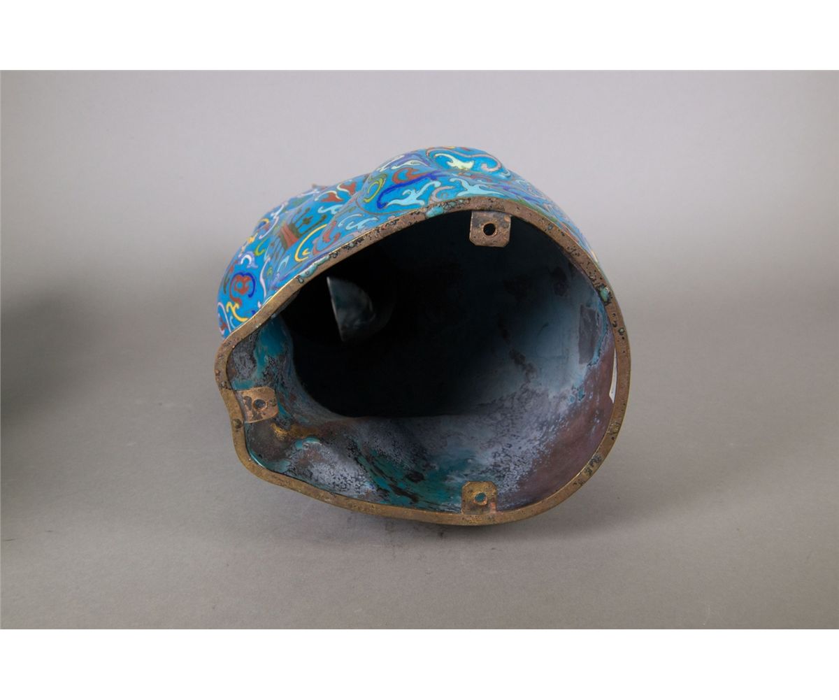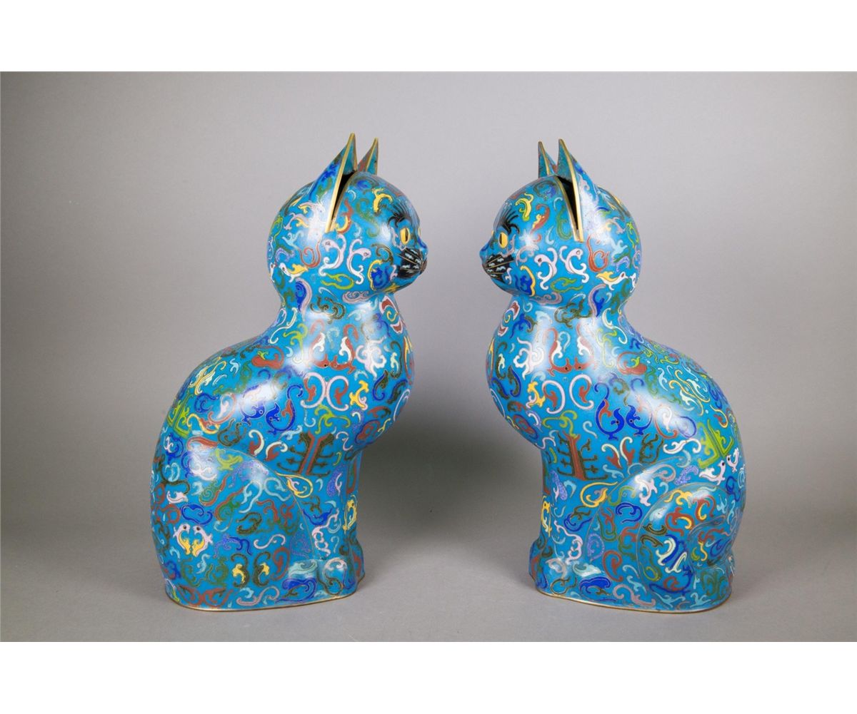 Pair of Chinese republic period cloisonne cats; featuring flower patterns on blue ground; H: 40 cm, W: 16 cm, 1939 grams each