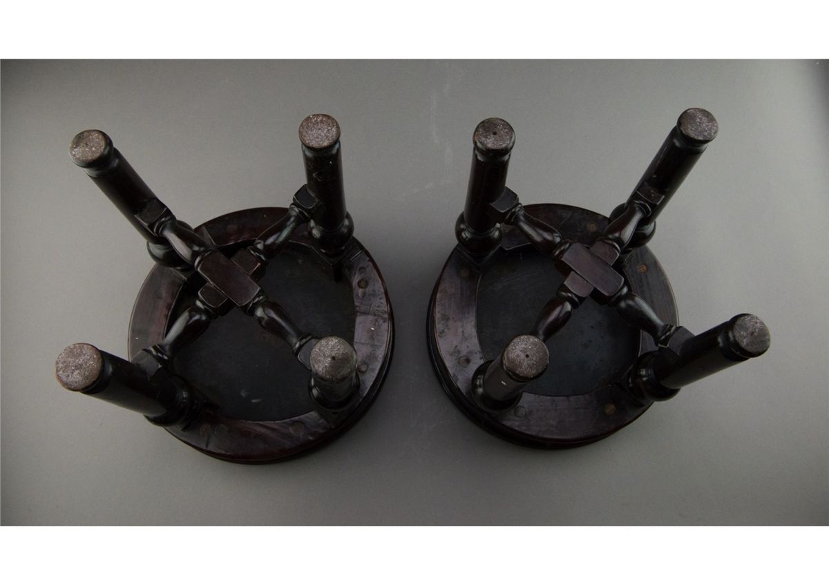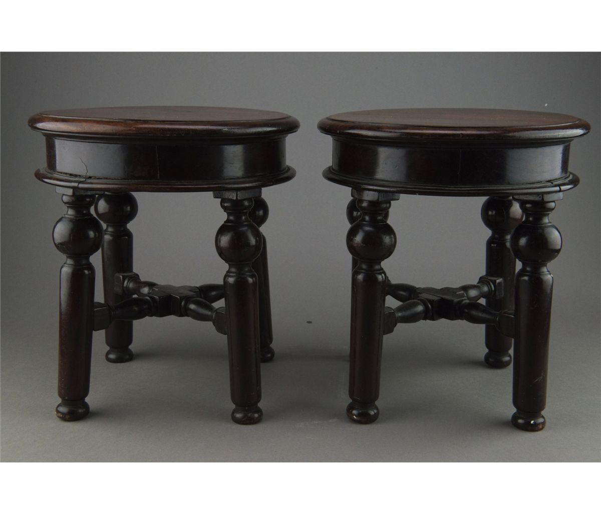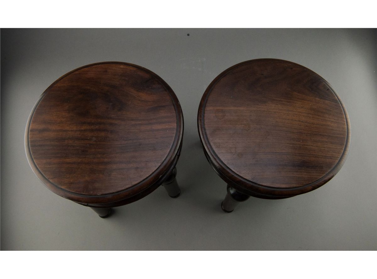 Pair of finely crafted Chinese Rosewood carved stools, with circular top supported on four legs with braces; nail-less construction with all joints; please request a condition report as it is sold as-is with all condition issue; H: 26 cm, D: