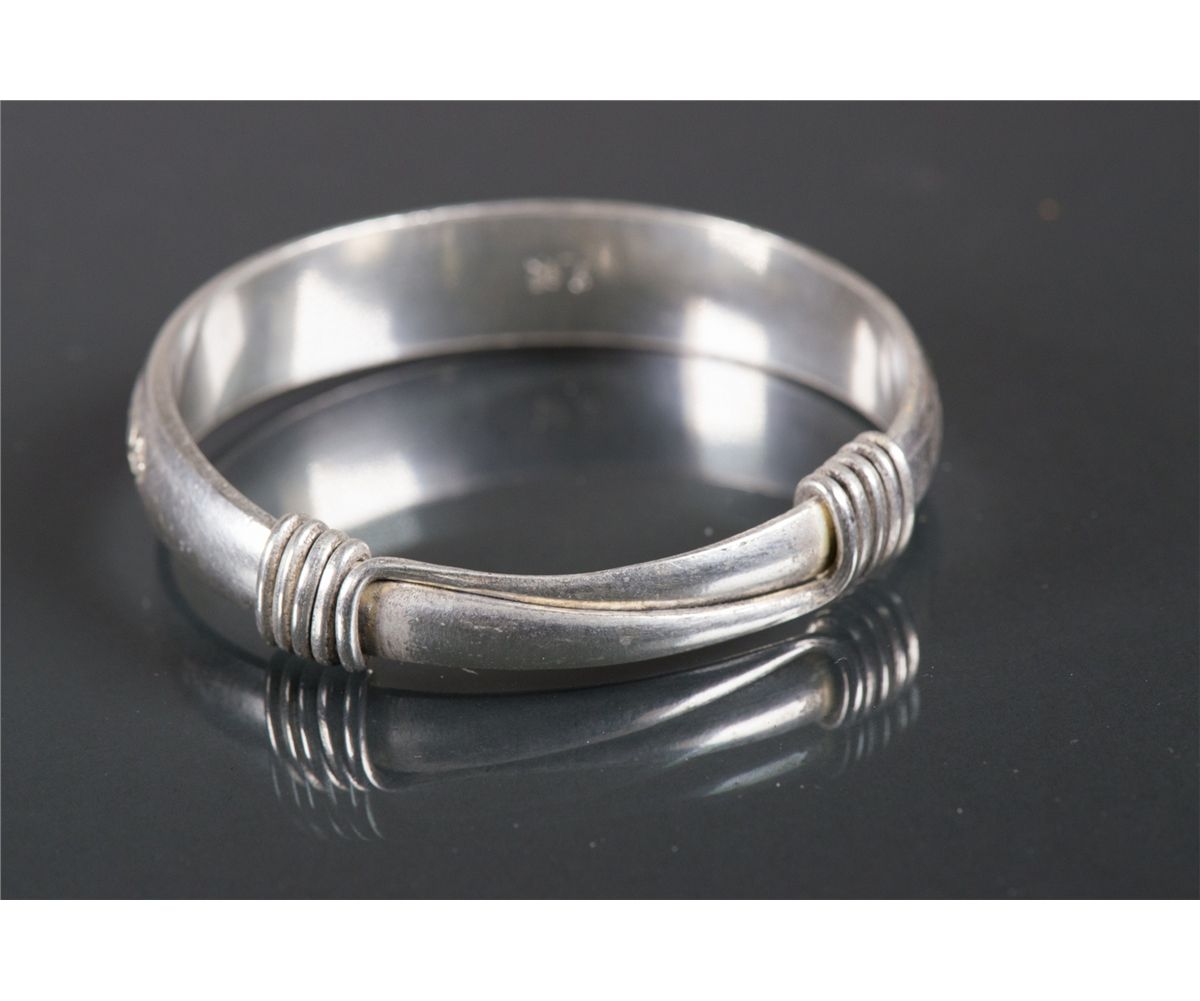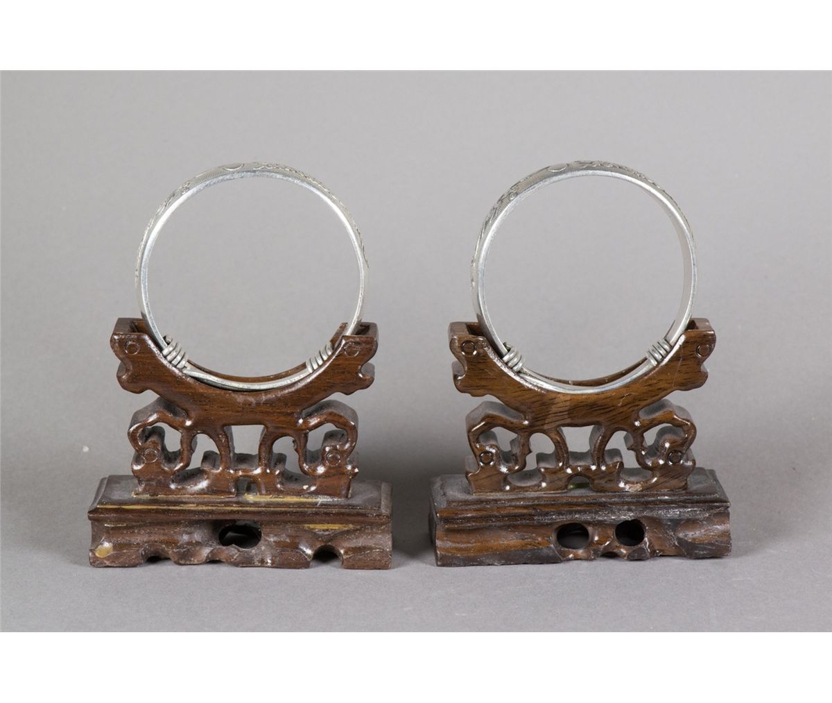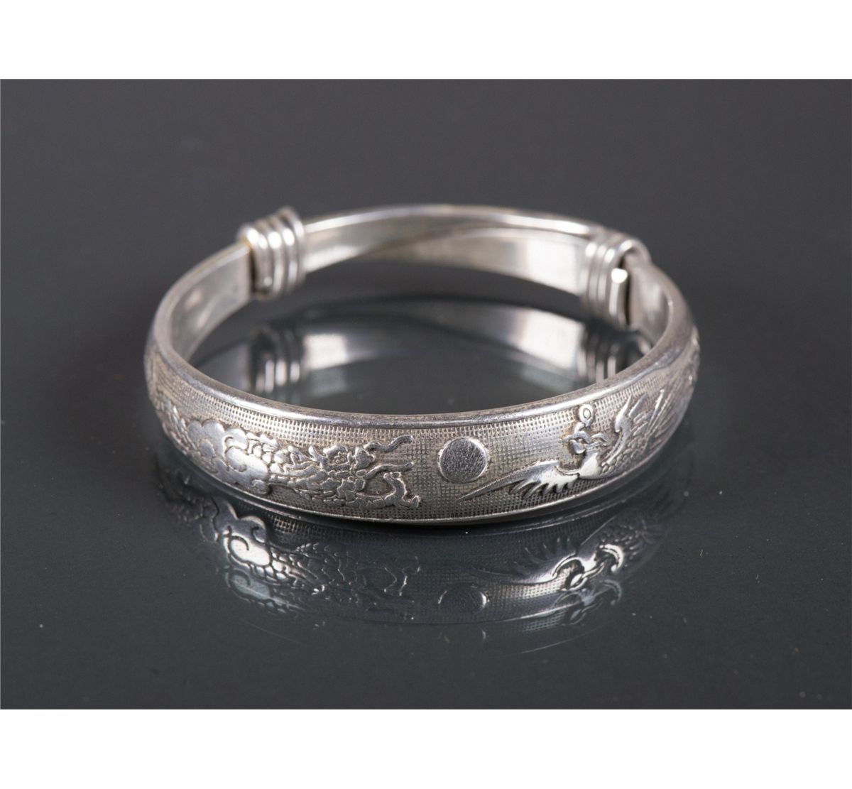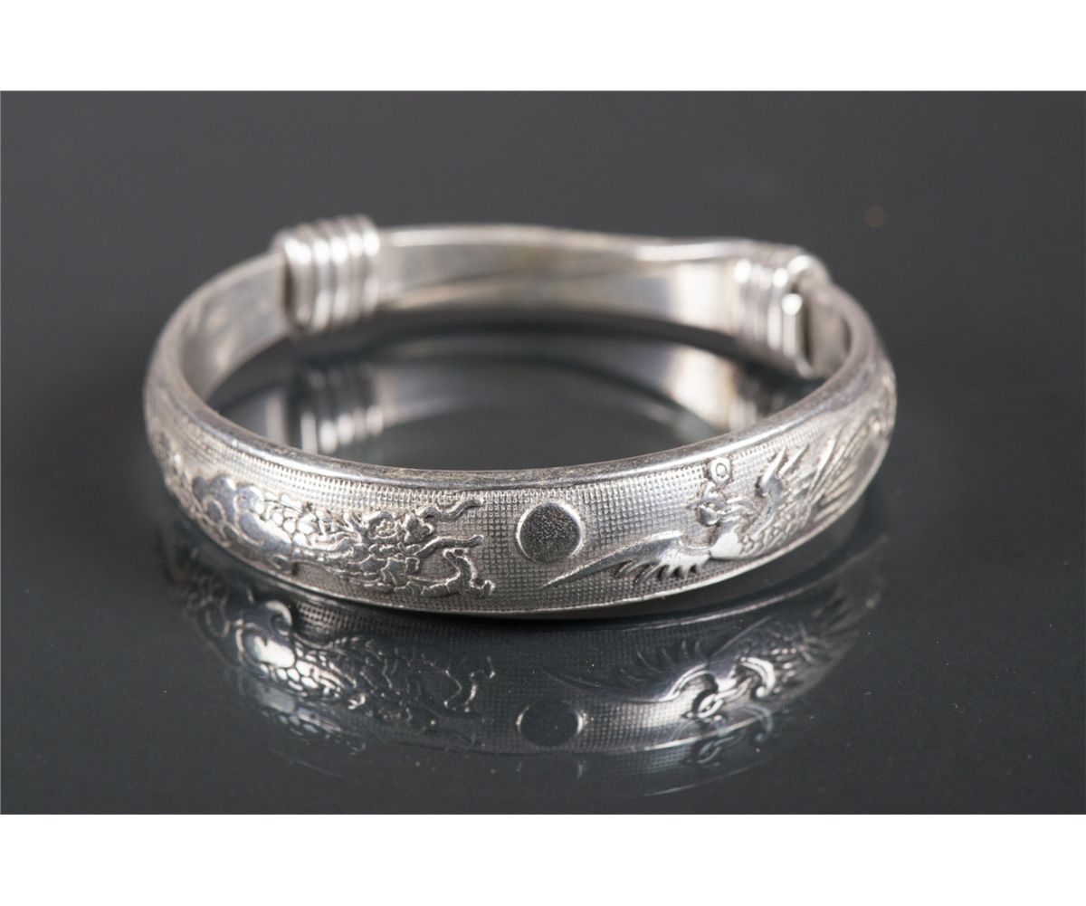 Pair of Chinese silver bracelets; featuring carved dragon and phoenix; D: 6 cm, 88 grams total