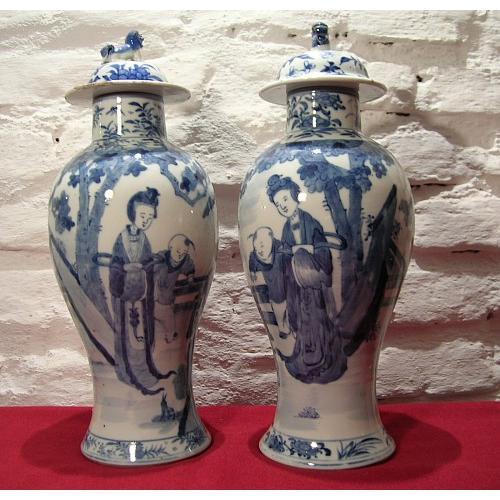 A pair of Vases probably Ming. Blue and white representing scenes of 2 child and a woman (in each Vases), all painted by hands. Each Vase has different draws between them. You can appreciate in the pictures.