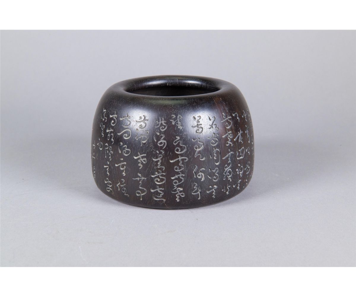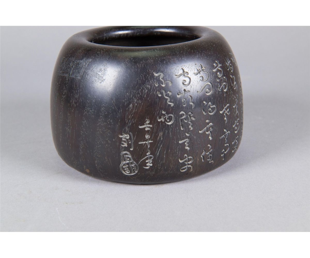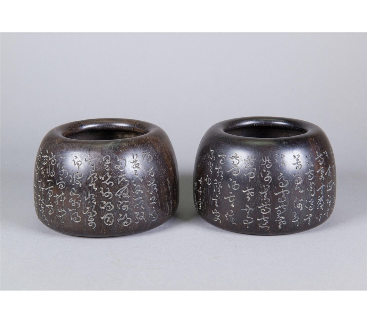 Pair of Chinese Go stones (Yunzi) Zitan bowls; of flattened sphere; with carvings of calligraphy on body; H: 8 cm, D: 14 cm, 908 grams both