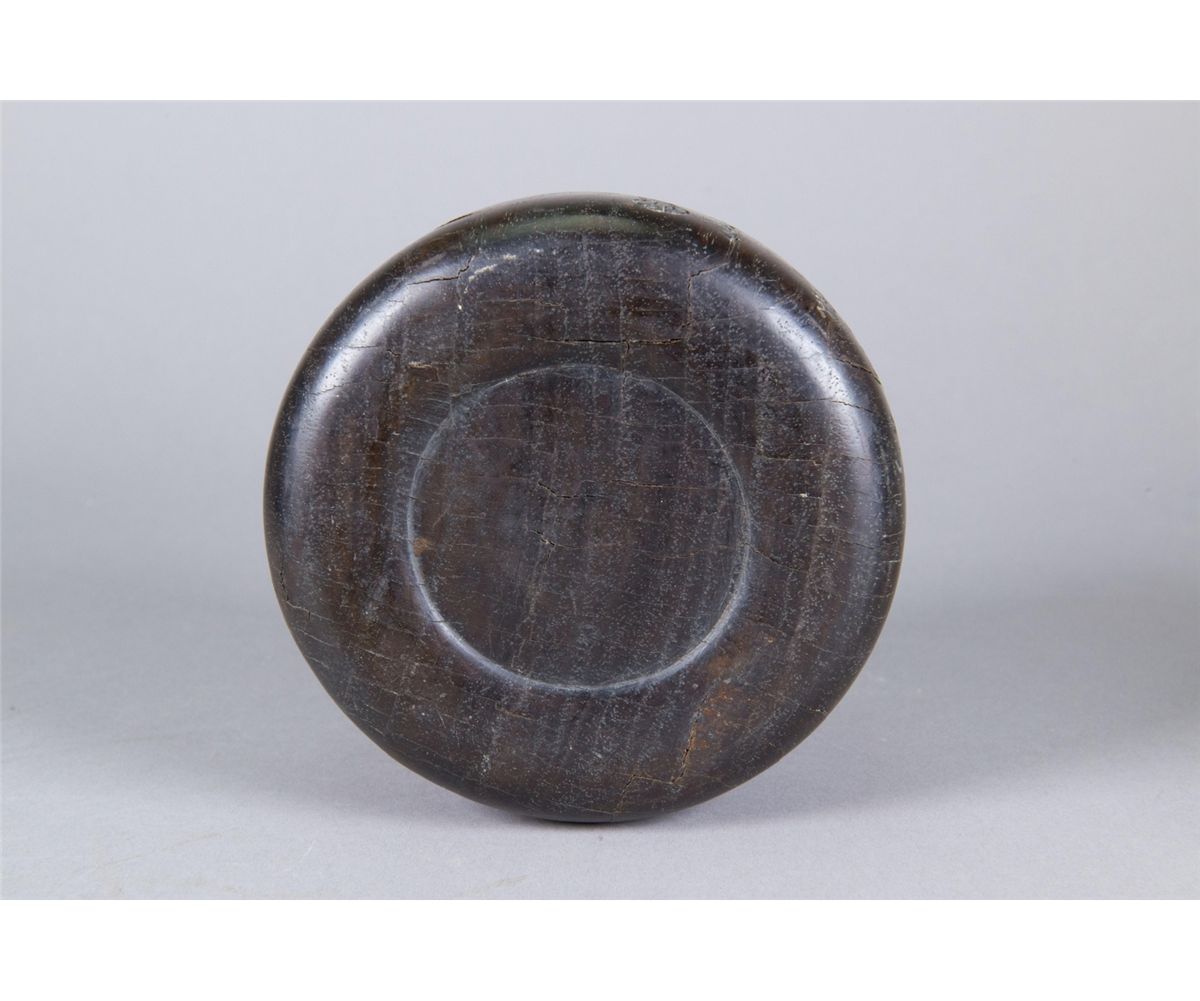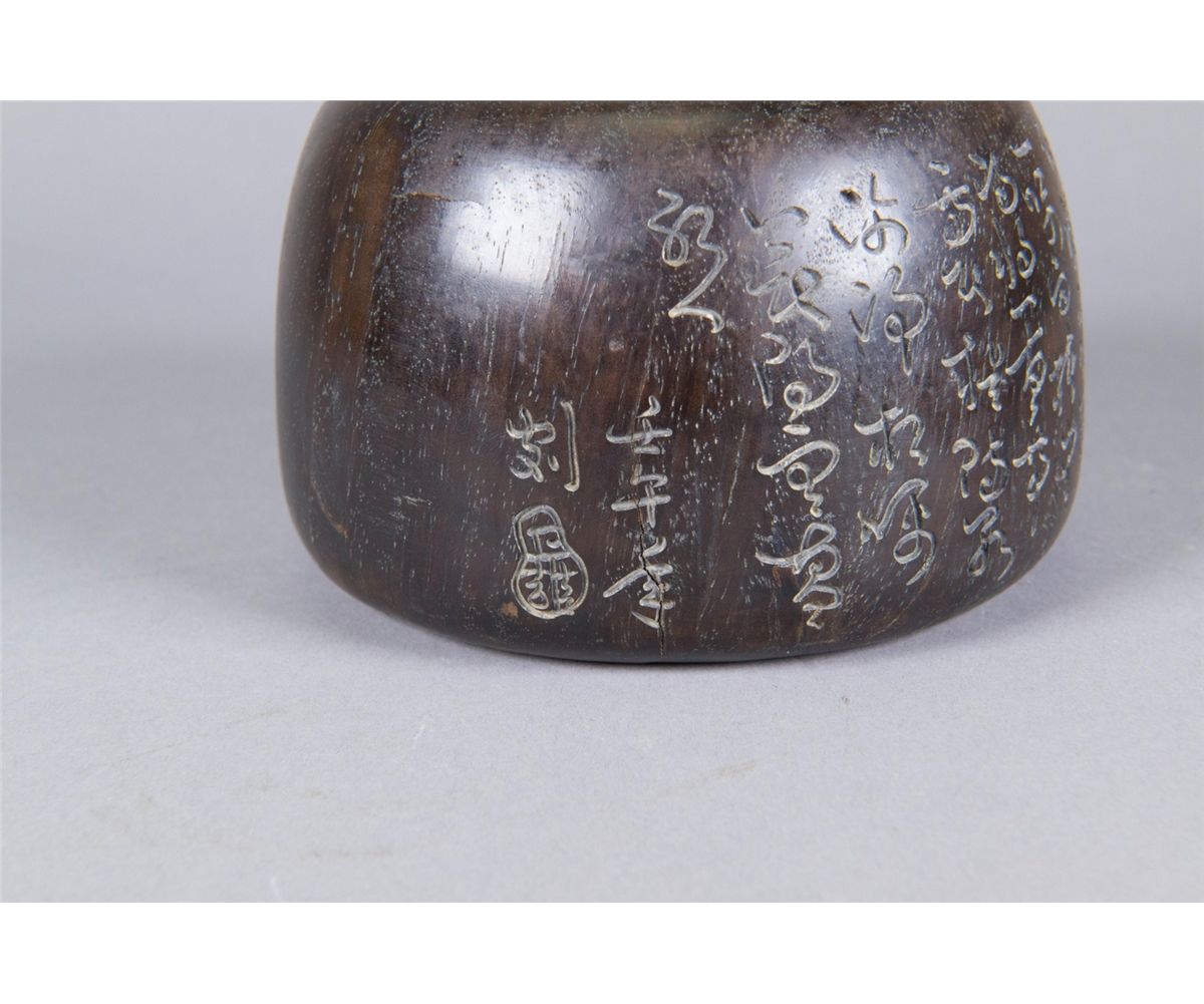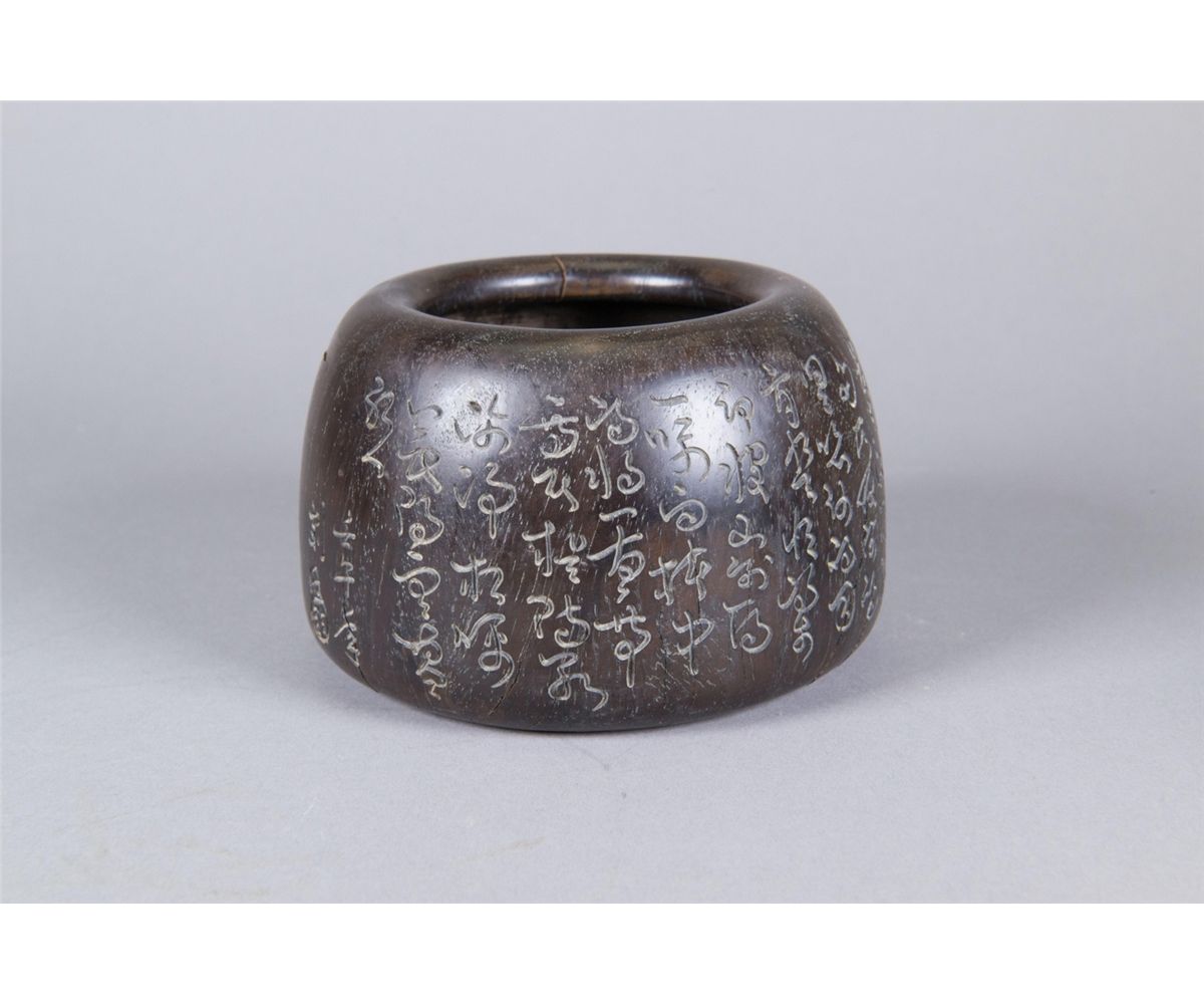 Pair of Chinese Go stones (Yunzi) Zitan bowls; of flattened sphere; with carvings of calligraphy on body; H: 8 cm, D: 14 cm, 908 grams both