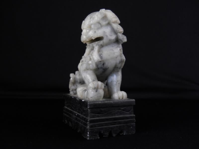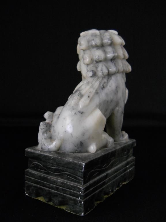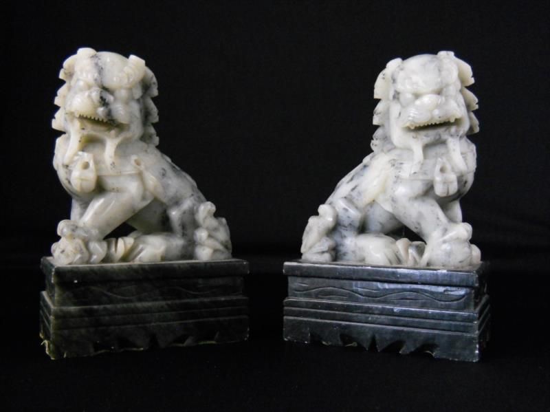 A pair of Chinese carved grey soapstone Dogs of Foo on a dark grey rectangular base, height 17.5cm.