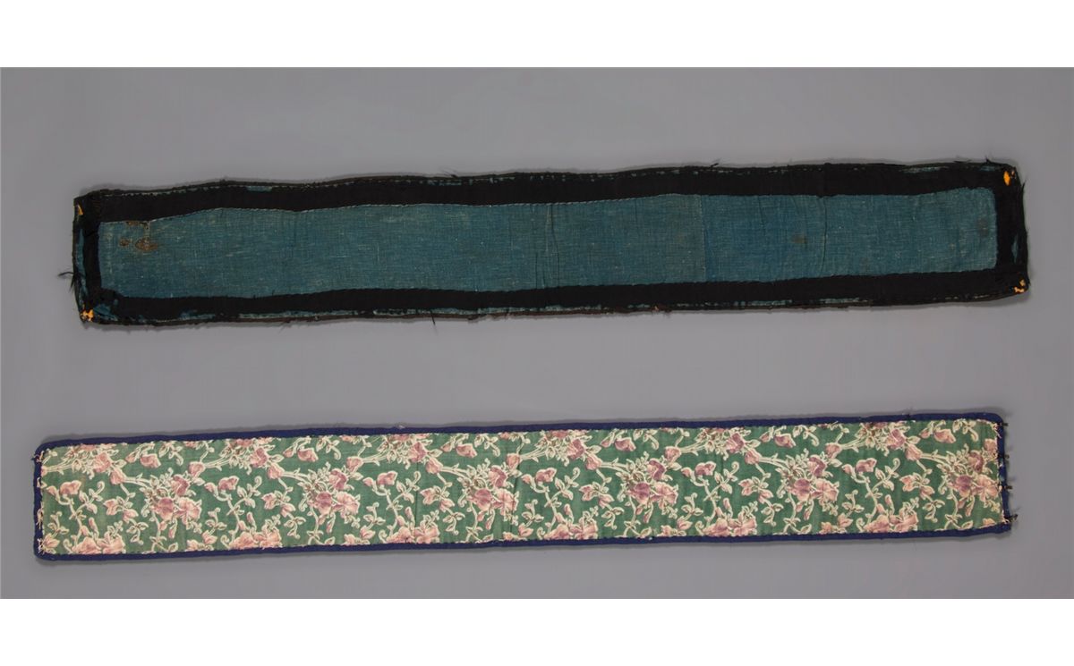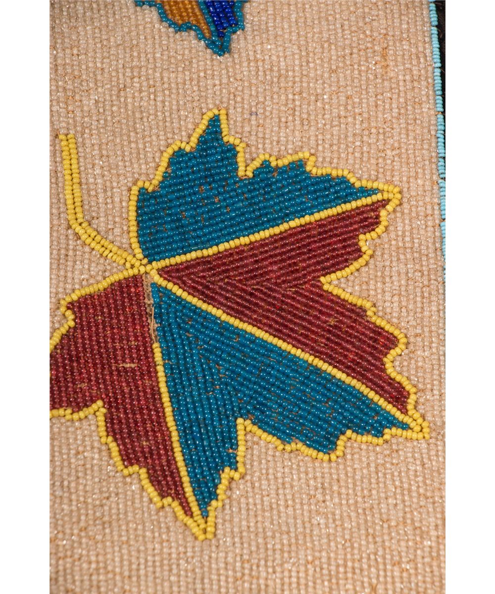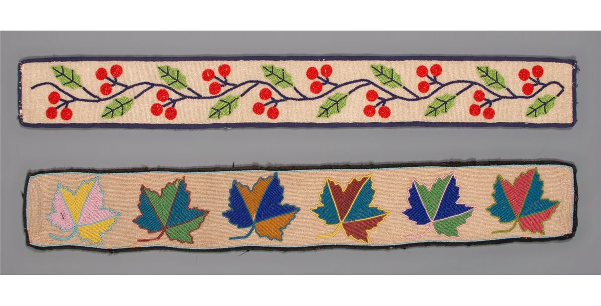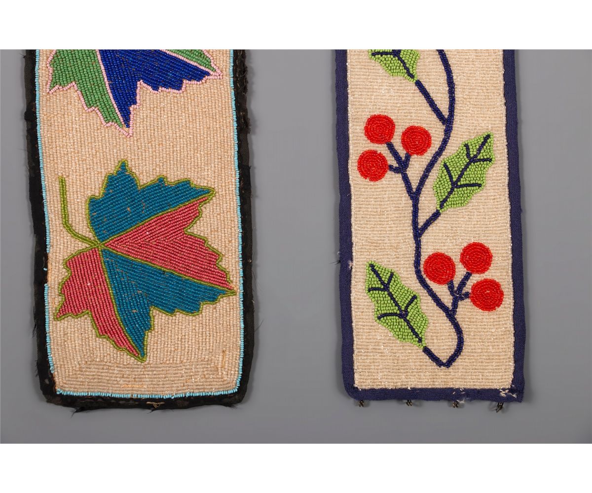 Pair of Chippewa Bandolier Sashes. The first measures 36" x 5.25", beaded in a leaf design. The second is 36" x 4.25", beaded with a berry vine design. Both are edged and backed with cloth. Early 20th century.