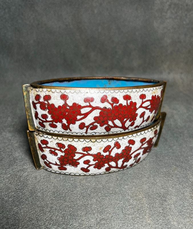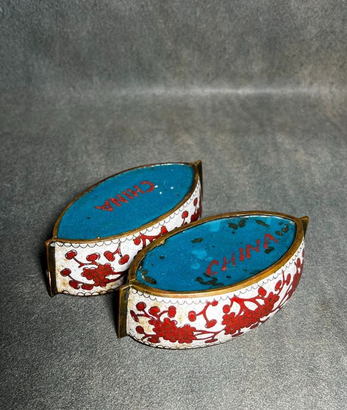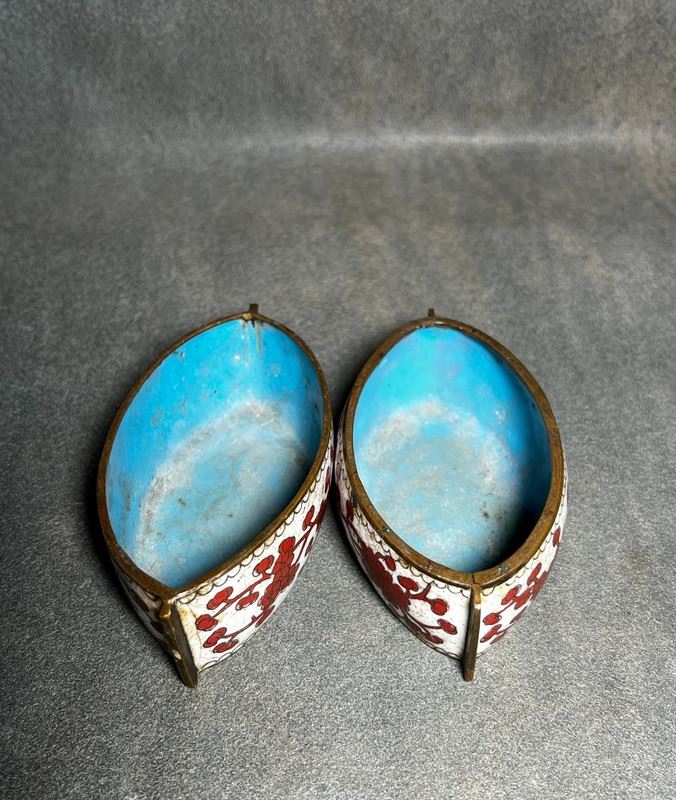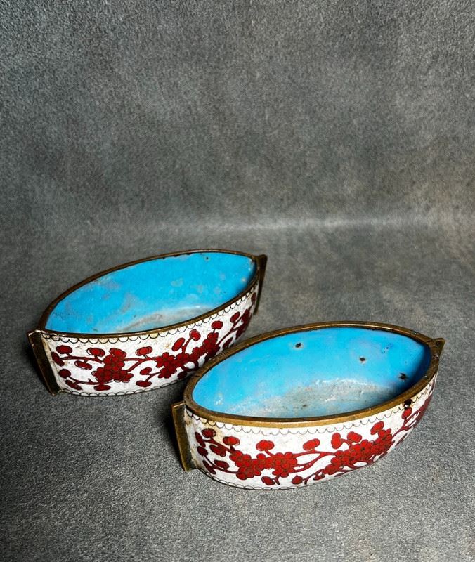 This pair of brush washers is crafted in the form of boats, with elongated and graceful profiles. Made with copper bodies and decorated in cloisonné enamel, the exteriors display red floral scrolls on a white ground, while the interiors are finished with turquoise enamel for contrast. Gilt-bronze rims add refinement to the overall design. Both functional as scholar’s desk objects and decorative as collectible cloisonné pieces, these boat-shaped brush washers are elegant examples of refined workmanship.