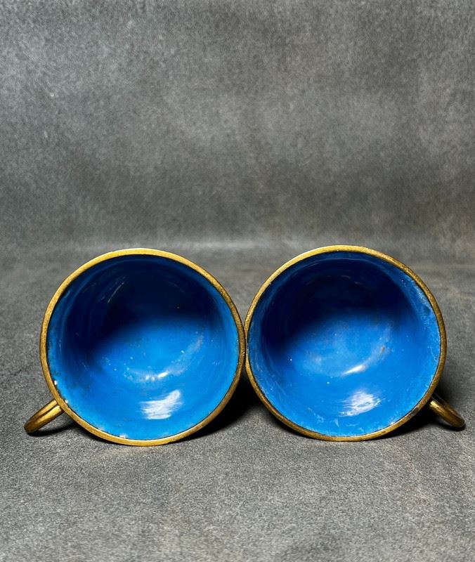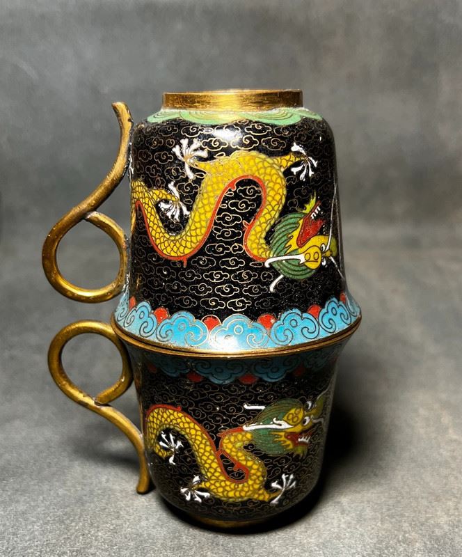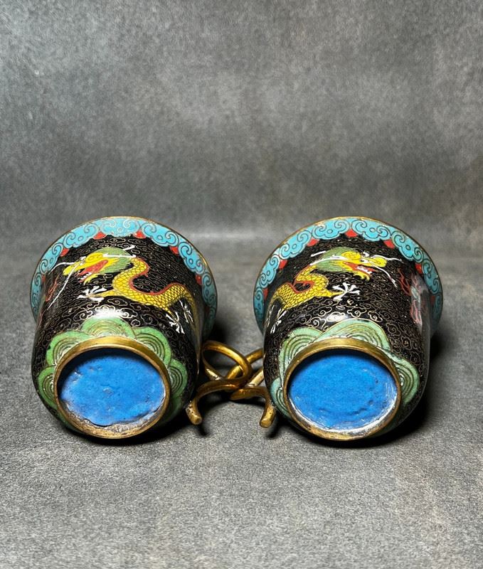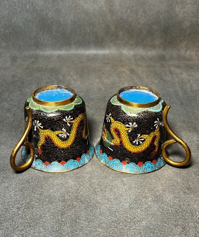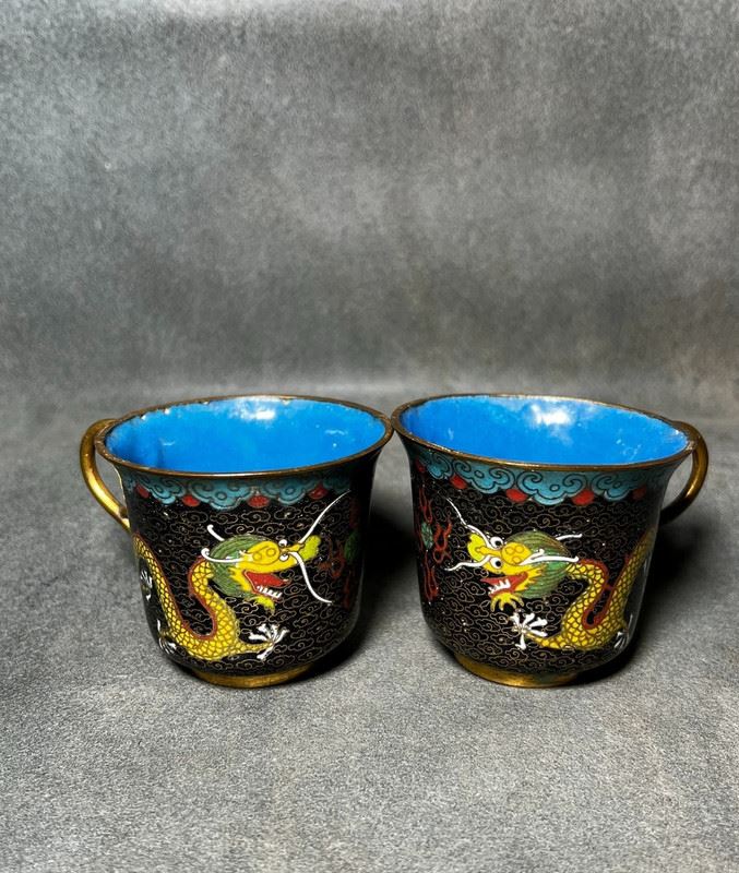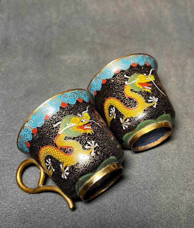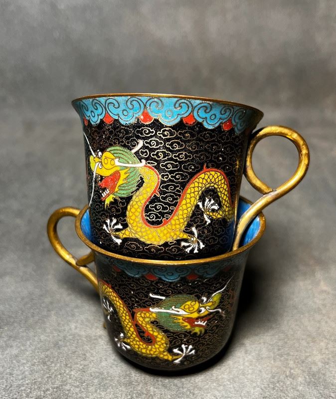 Copper body with cloisonné enamel. The exterior features a black ground decorated with gilt wire spirals and vivid five-clawed dragons chasing flaming pearls, highlighted in yellow enamel. The interior rim is turquoise blue, with cloud motifs near the mouth. The handles are gilded, enhancing the elegant and regal appearance. These cups combine practical use with refined artistic beauty.