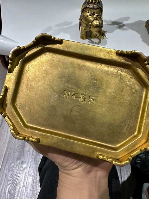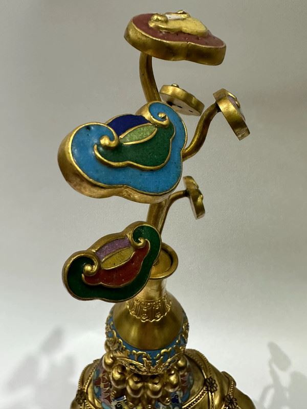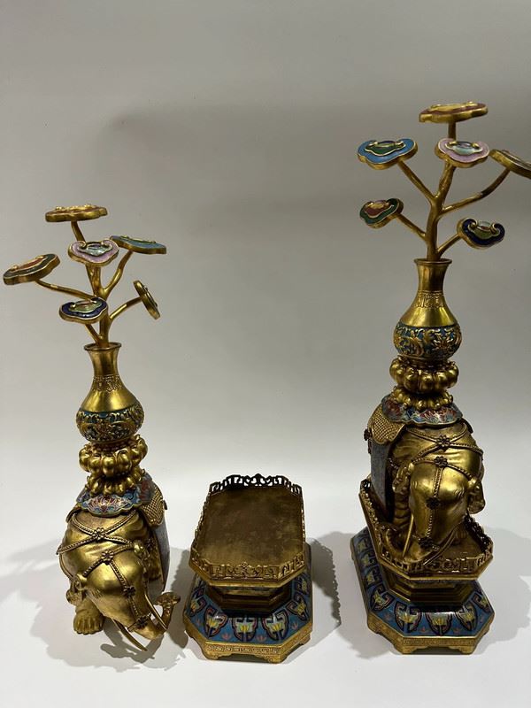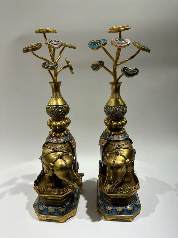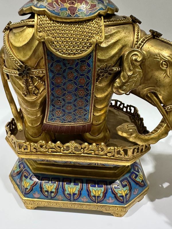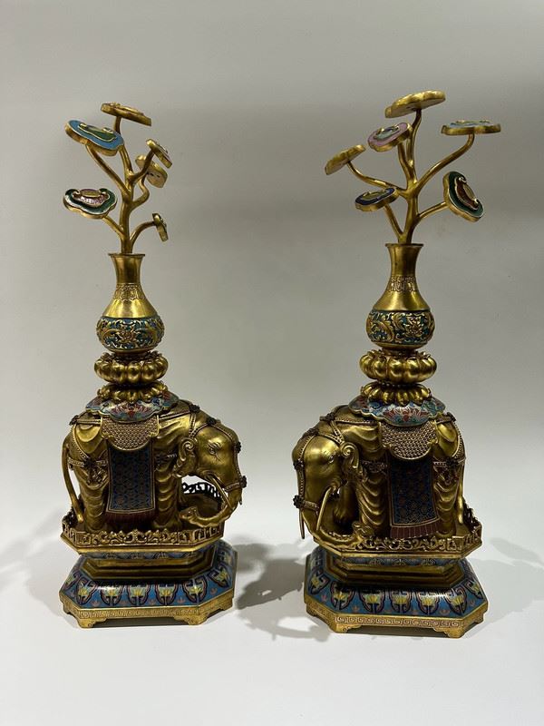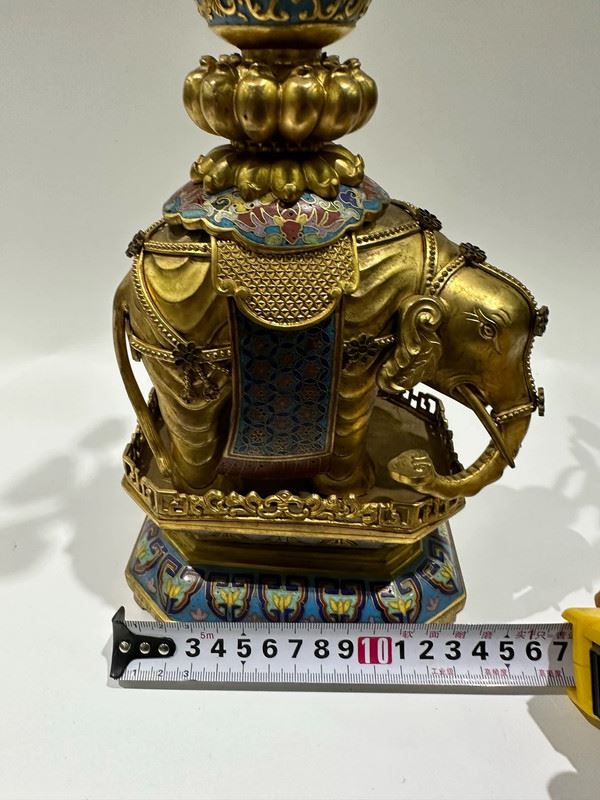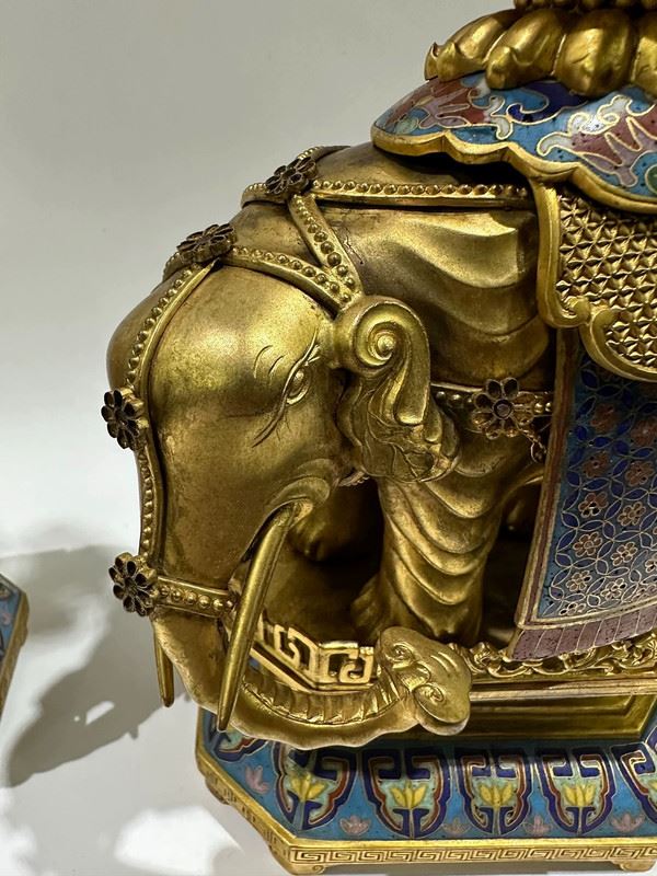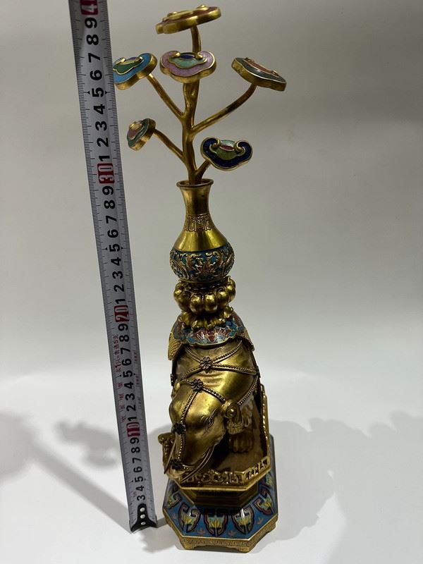 This pair of elephant figures is crafted from gilt bronze and decorated with vibrant cloisonné enamel, showcasing exceptional craftsmanship. Each elephant is richly adorned with ornate saddles and enamel trappings, exuding grandeur and elegance. Upon their backs rest vases with lotus stems, symbolizing peace and prosperity, embodying the auspicious phrase “Taiping Youxiang” (peaceful times signified by elephants). The octagonal bases are decorated with lotus petal designs and intricate patterns, adding balance and refinement. With their majestic form and auspicious symbolism, these figures serve as both decorative treasures and valuable collectibles.