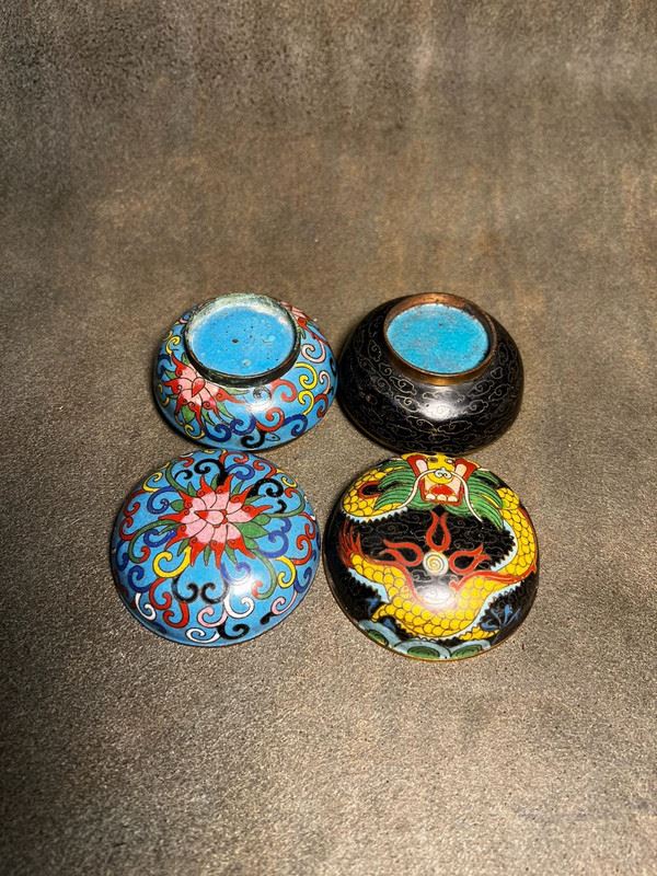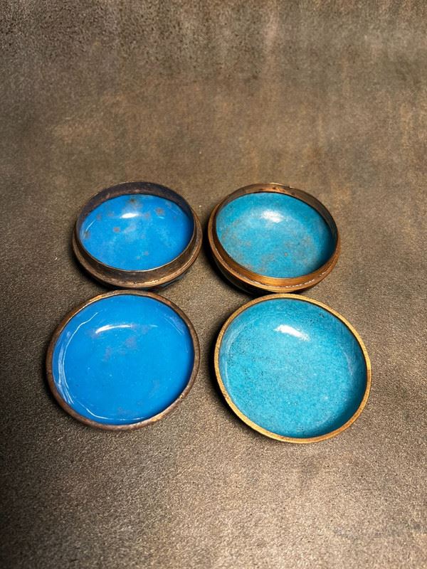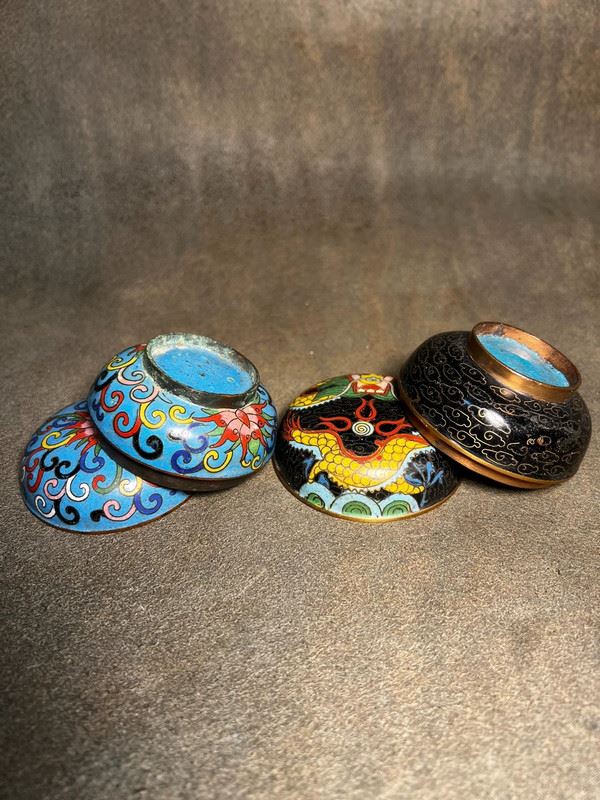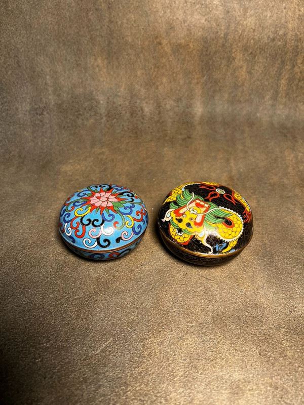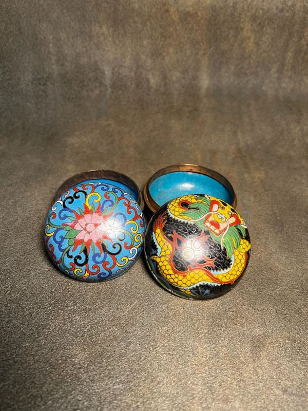 This pair of ink paste boxes is crafted with copper bodies and decorated in cloisonné enamel. One features a lotus motif on a blue ground, elegant and vibrant, while the other displays a powerful yellow dragon on a black ground, symbolizing authority and auspiciousness. Compact in form with tightly fitting lids, these boxes combine practical function as scholar’s desk objects with the refinement of collectible cloisonné art.