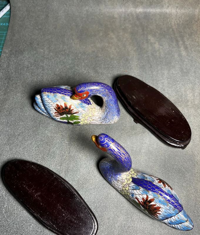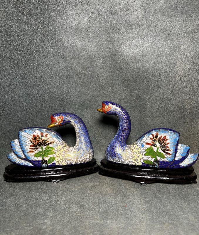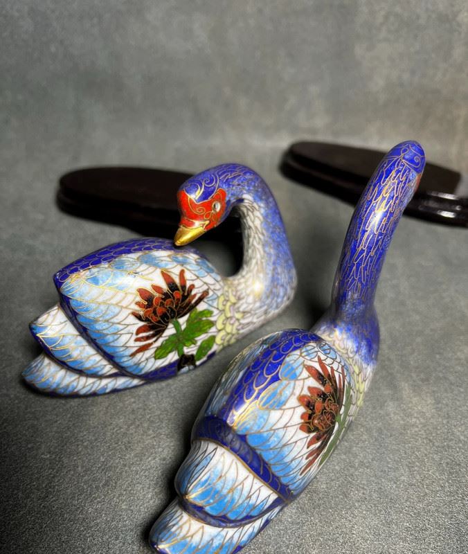 This pair of swan figures is crafted with copper bodies and decorated in cloisonné enamel. Rendered mainly in blue and white, the feathers are delicately detailed, while blooming lotus flowers with red and green accents adorn the wings, symbolizing purity and harmony. The swans’ graceful postures vividly capture their elegance as if gliding on water. Displayed on wooden stands, these ornaments exude refinement and serve as both decorative and collectible works of cloisonné artistry.