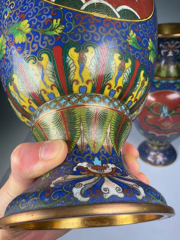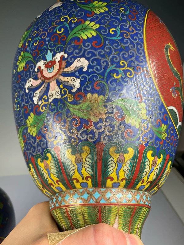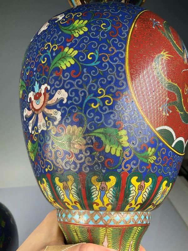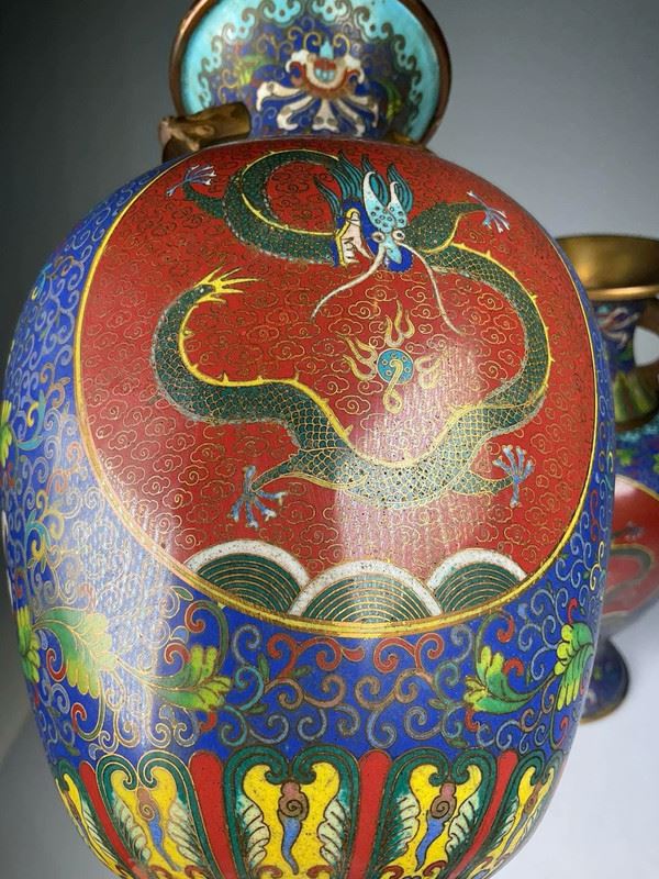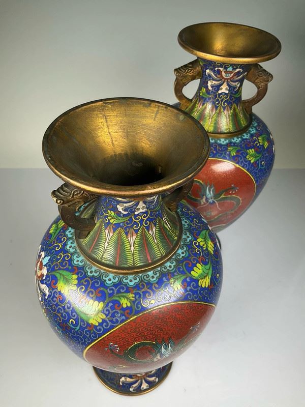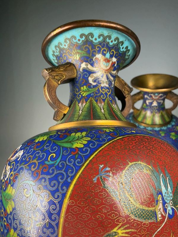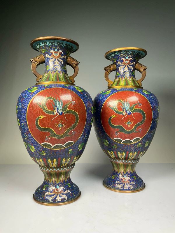A pair of large cloisonné enamel vases, each with copper body and vibrant enamels. The main panel features two dragons chasing a flaming pearl against a rich red ground, symbolizing power and prosperity. The shoulders are adorned with gilt beast handles, while the neck and foot are decorated with intricate scrolling lotus and auspicious motifs. These imposing vases were typically made for display, representing grandeur and auspicious blessings.