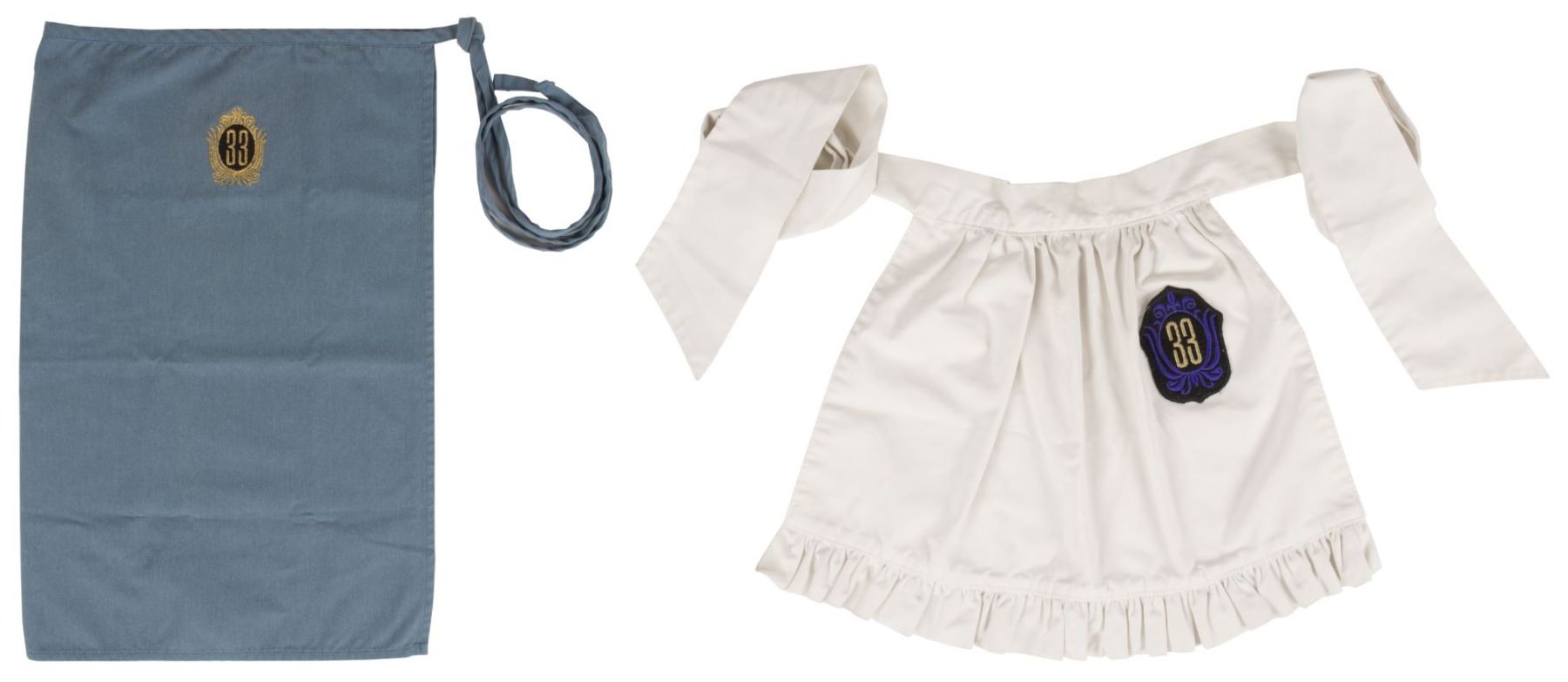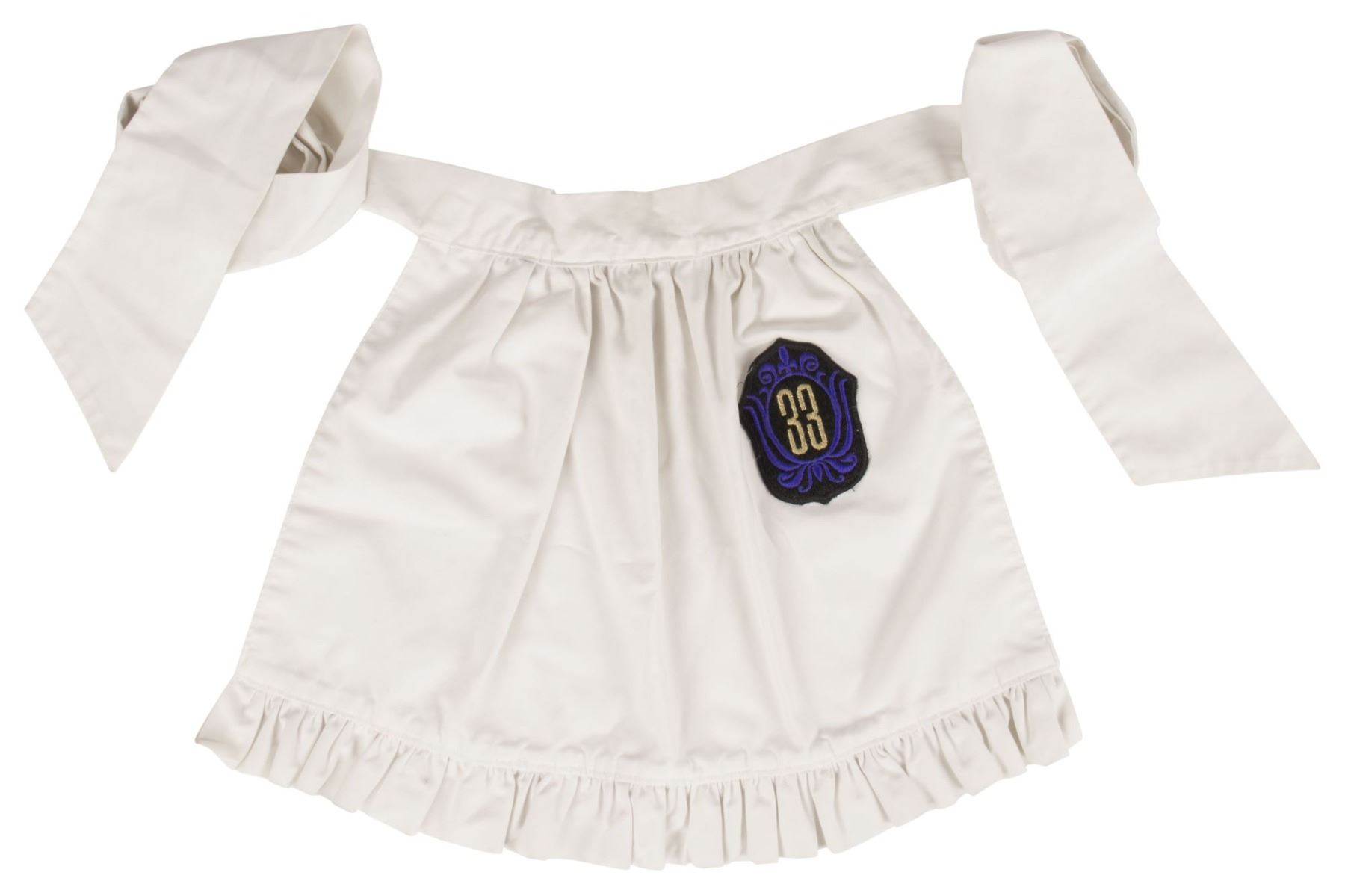 (Disneyland, c.2000s) A pair of aprons worn by male and female cast members at Disneyland's exclusive Club 33. The male apron features an embroidered Club 33 logo on teal fabric and the female apron features a Club 33 patch over white fabric. The aprons measure 22"x27" and 15"x20" respectively, and the condition is very good with some wear from use. The female apron still has its original Disney wardrobe department label inside.