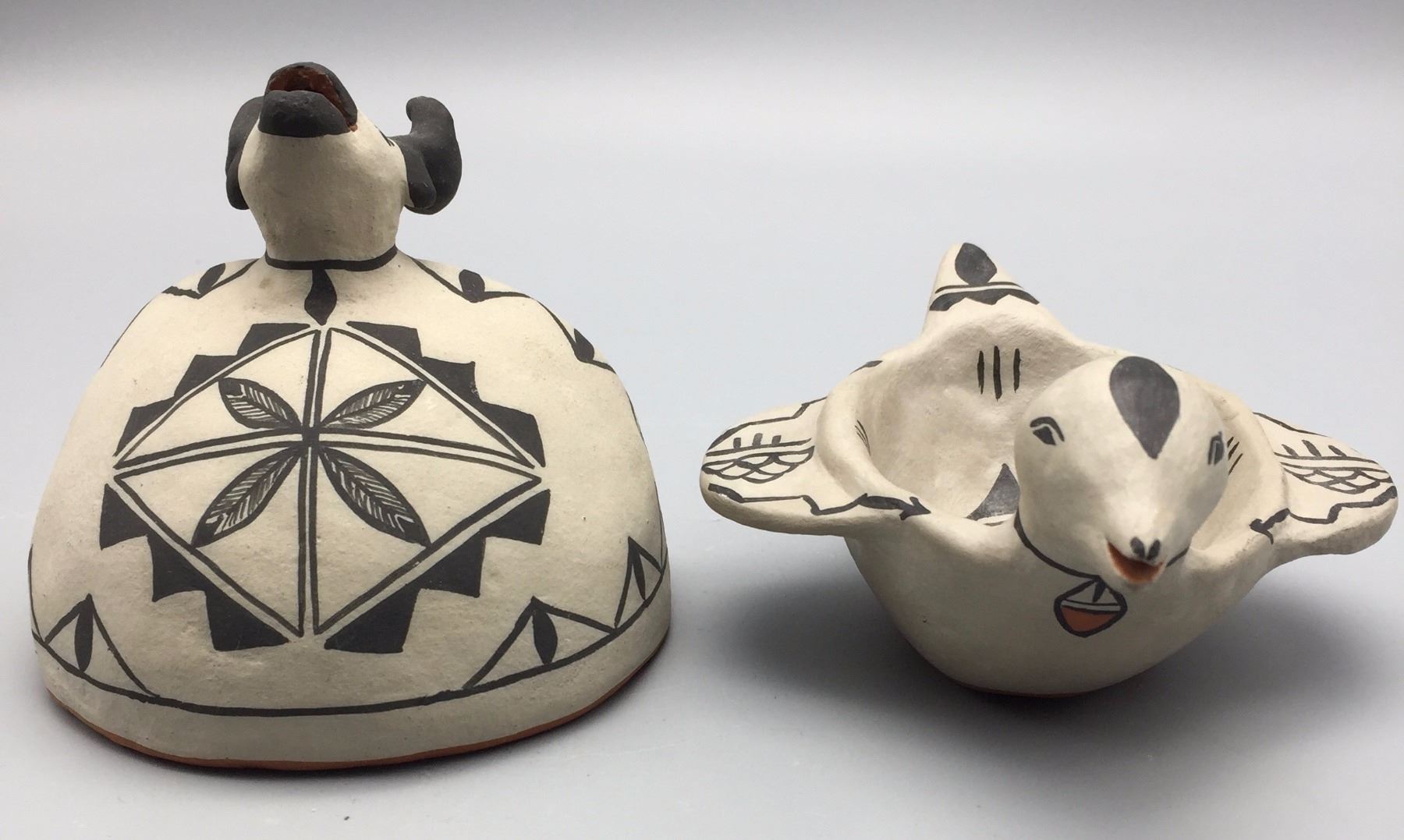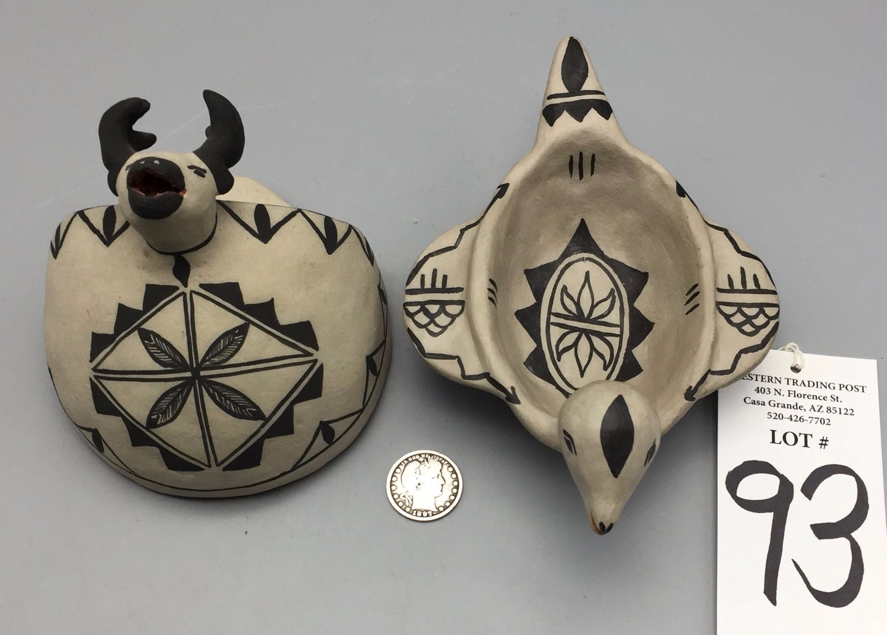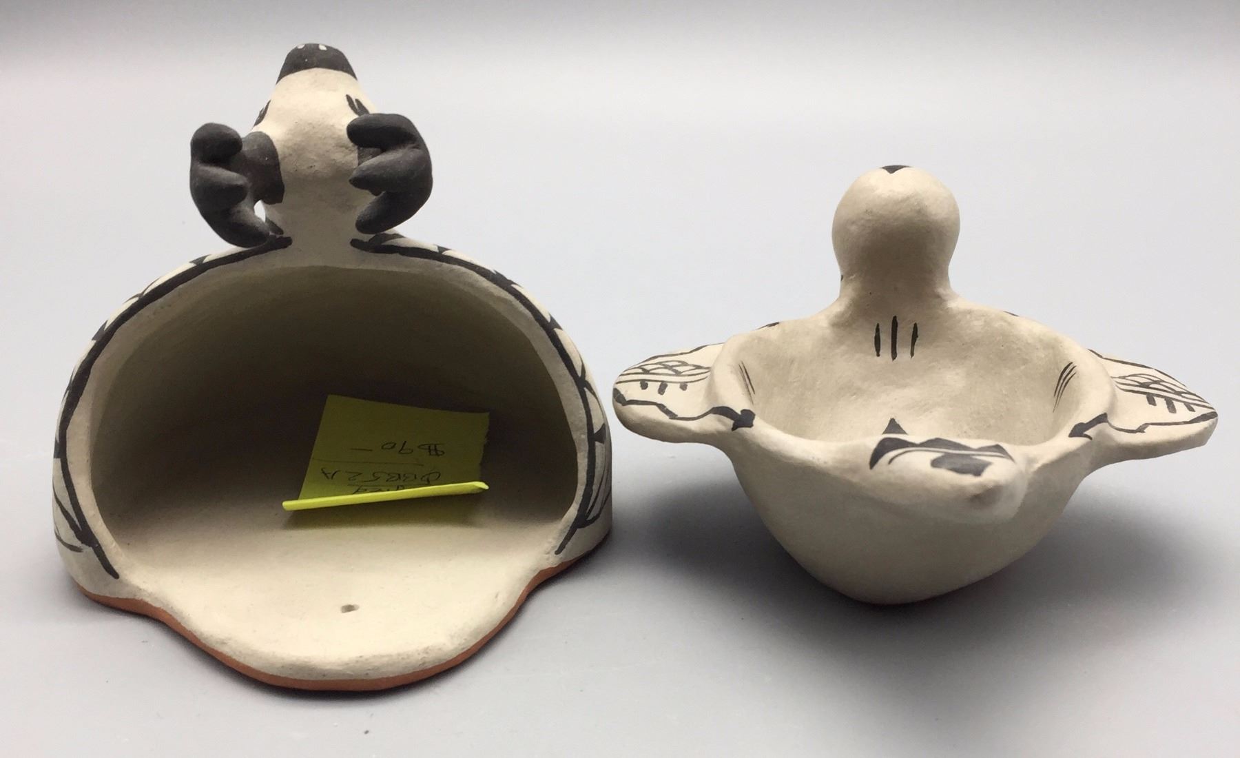 Maker: Martha Arquero, Cochiti. Approx. Age: Circa 1980s. Size: 1) 4 1/4” w x 4 1/4” h x 4” d. 2) 4 1/4” w x 7” l x 2 1/2” d. Additional Info: Pair of handmade/hand-painted effigy pots by Martha Arquero. Condition: Good for their age, normal wear expected. Please look closely at the pictures - they are an important part of our description. Shipping: There will be a $8 handling / packaging fee for shipping this lot. The actual cost of postage will be added on top of that.