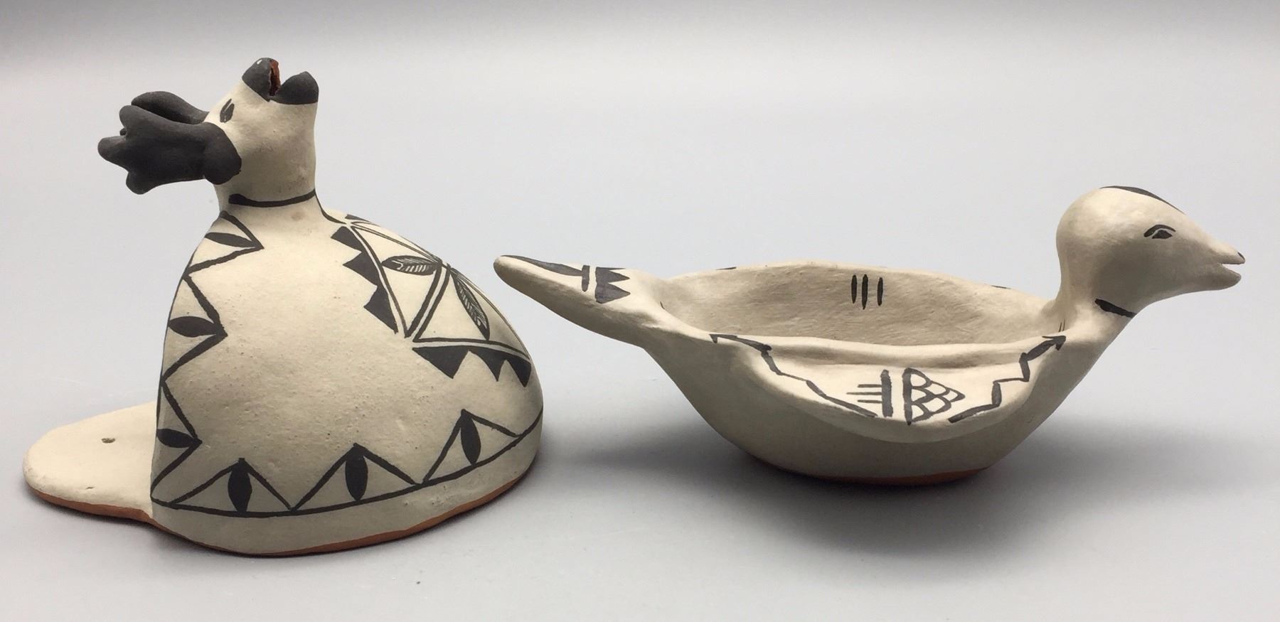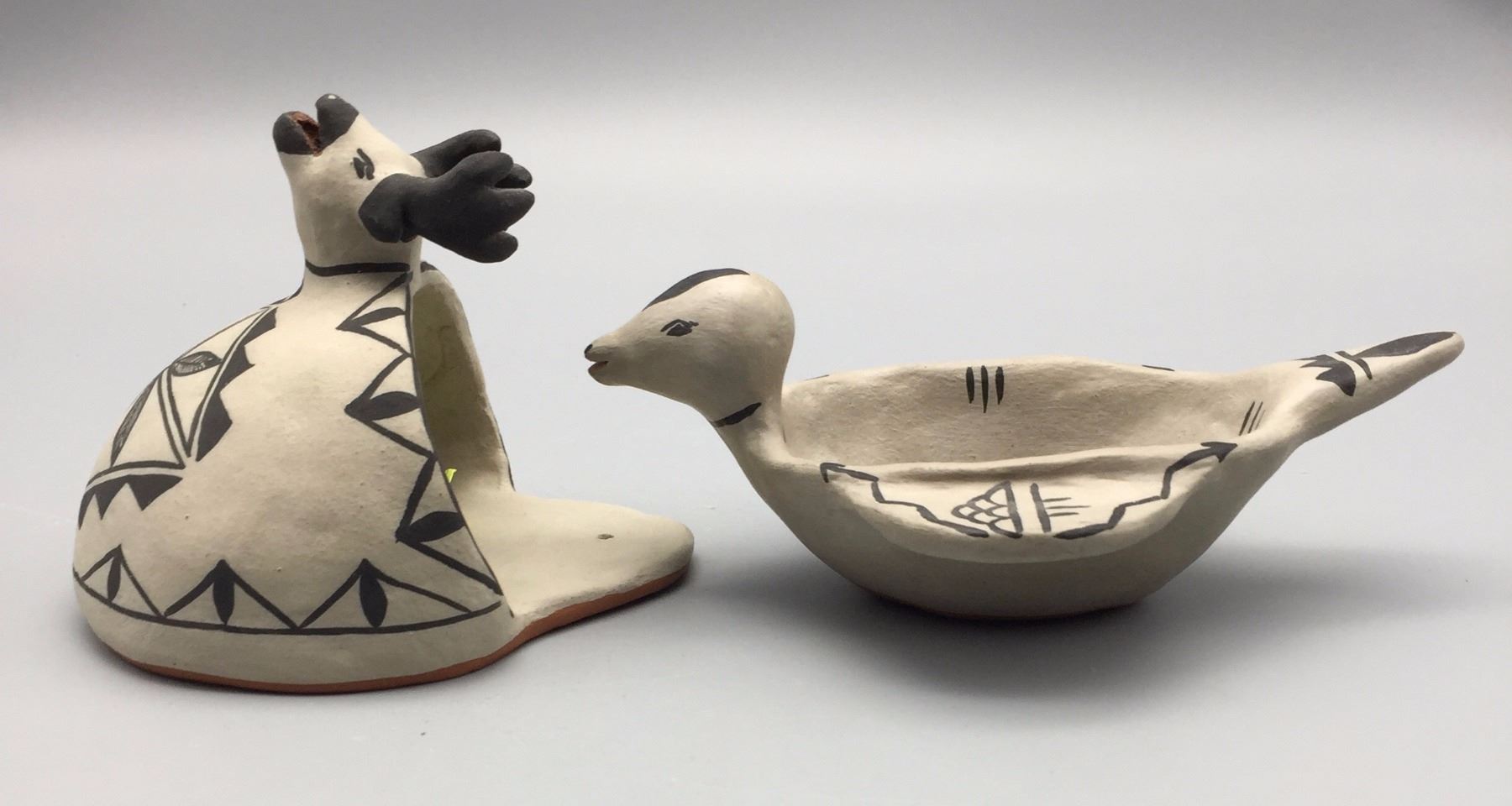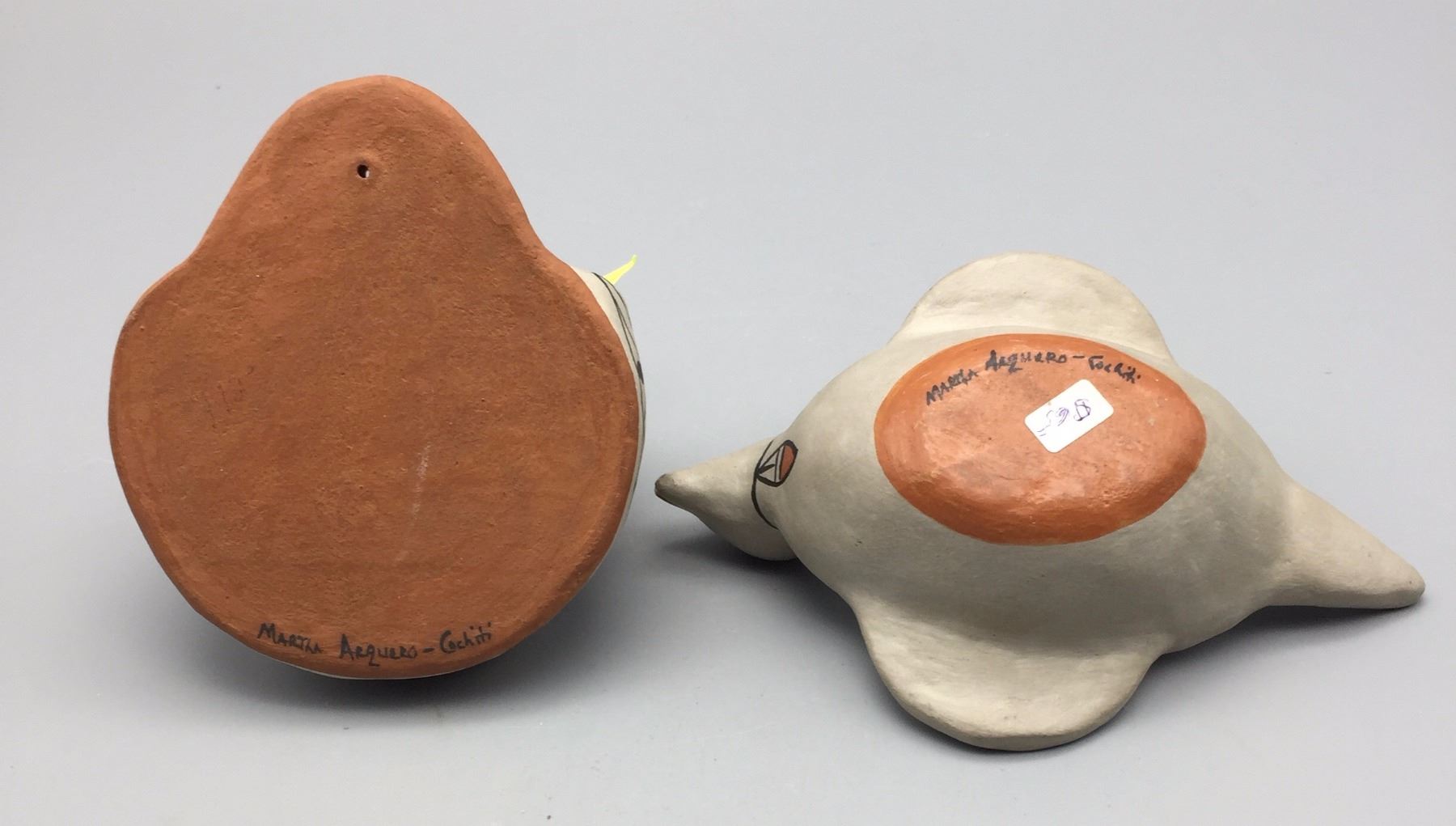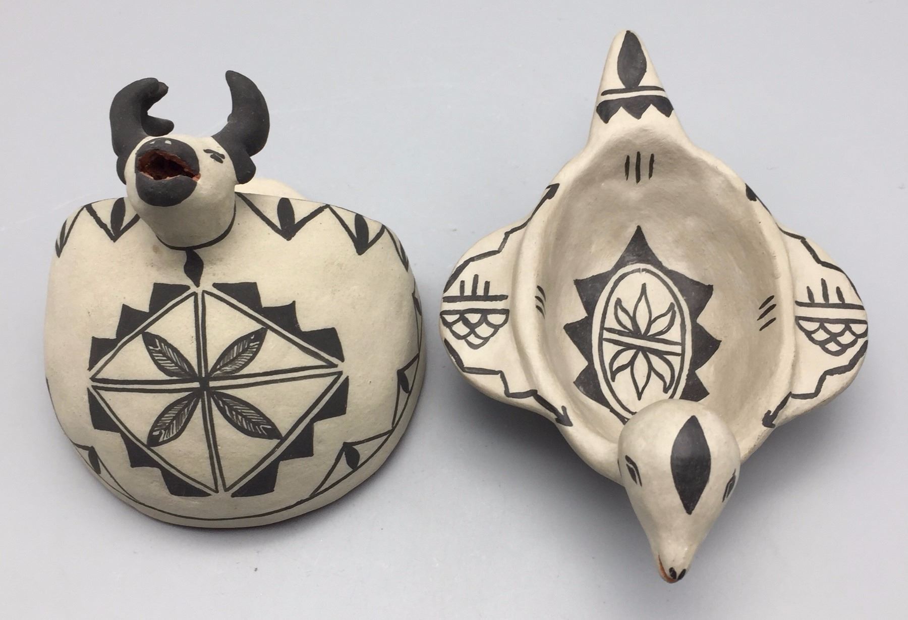 Maker: Martha Arquero, Cochiti. Approx. Age: Circa 1980s. Size: 1) 4 1/4” w x 4 1/4” h x 4” d. 2) 4 1/4” w x 7” l x 2 1/2” d. Additional Info: Pair of handmade/hand-painted effigy pots by Martha Arquero. Condition: Good for their age, normal wear expected. Please look closely at the pictures - they are an important part of our description. Shipping: There will be a $8 handling / packaging fee for shipping this lot. The actual cost of postage will be added on top of that.