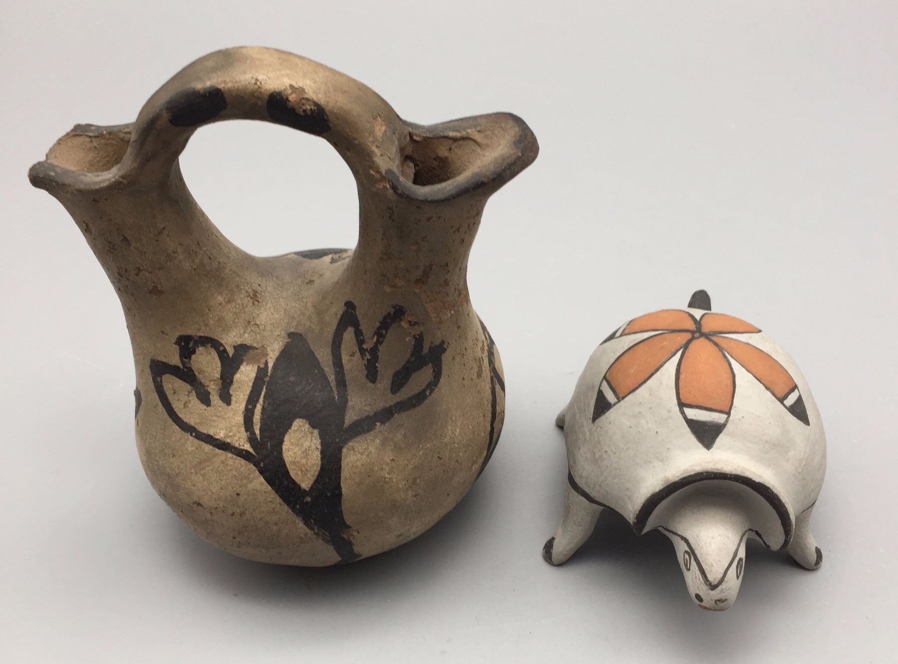 Maker: Unknown Cochiti makers. Approx. Age: wedding vase is pretty early, Turtle effigy is more modern. Size: 1) 2 1/2” w x 4 1/4” h x 2 1/2” d. And #2 is 4 1/2” w x 5 1/2”. Additional Info: Cochiti handmade/hand-painted effigy and wedding vase. Condition: Good for their age, chip in rim of the wedding vase. Please look closely at the pictures - they are an important part of our description. Shipping: There will be a $8 handling / packaging fee for shipping this lot. The actual cost of postage will be added on top of that.