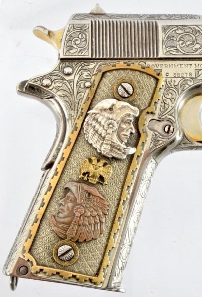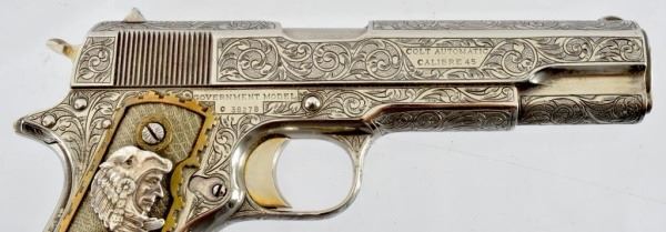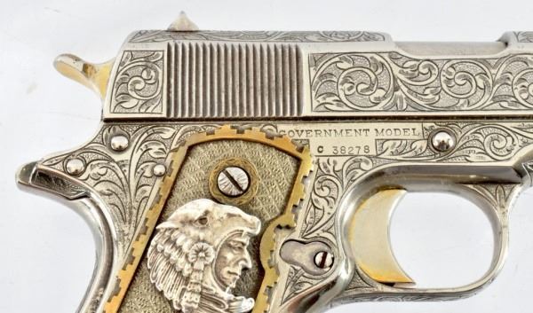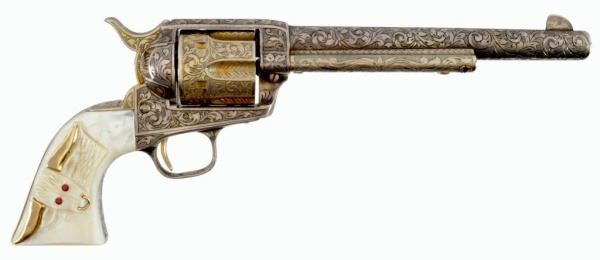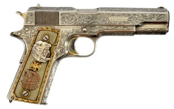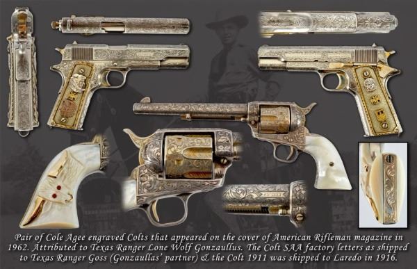 * Attributed to legendary Texas Ranger Lone Wolf Gonzaullus. The guns appeared on the 1962 cover of American Rifleman magazine. Colt Model 1873 SAA factory letters Texas Ranger Goss, who was Lone Wolf Gonzaullus' partner. The 1911 shipped to Laredo Texas in 1916. Both guns are by master engraver, Cole Agee.