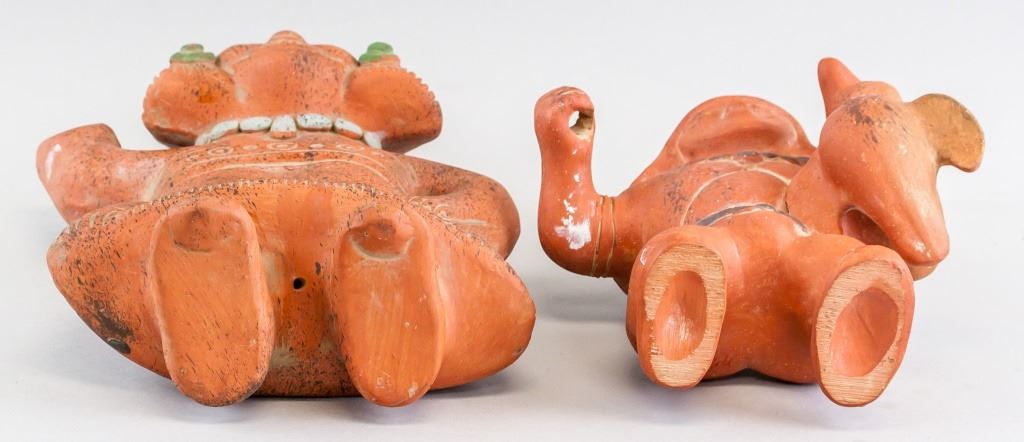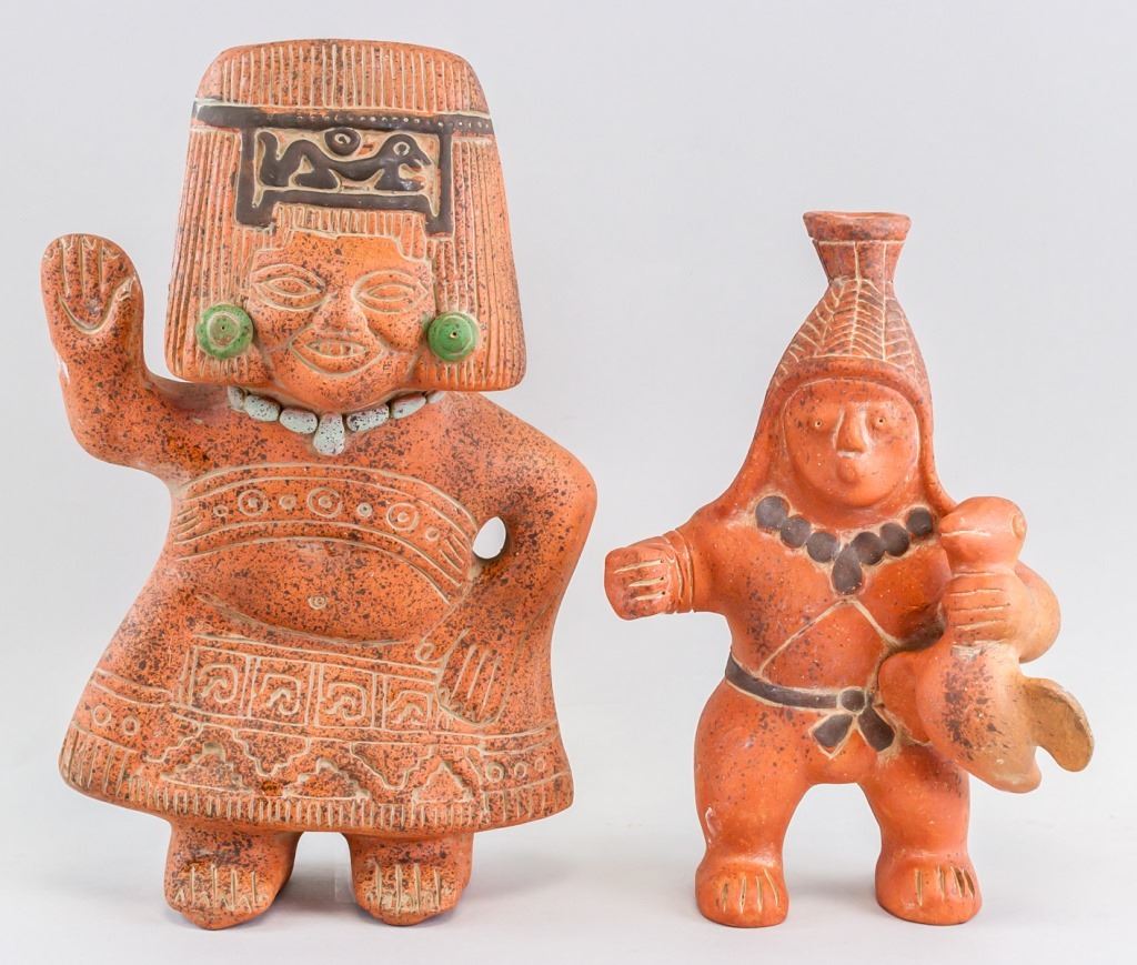 Colombian pottery figures. One of a woman with green earrings, another of a figure holding a duck by the neck. Both of orange tone. 36 x 21 cm. 2,837 grams (total).