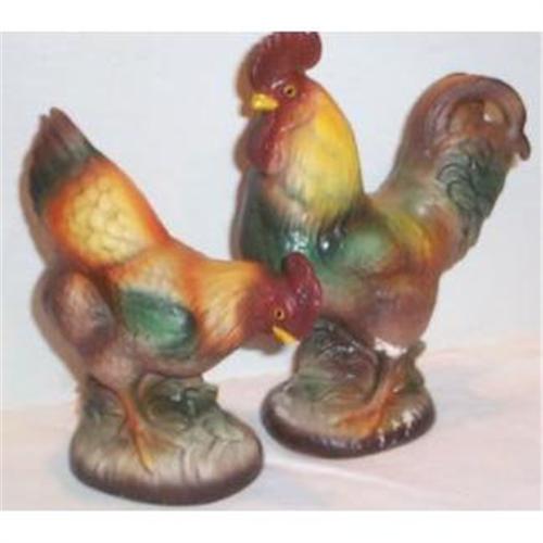 We are offering you a pair of Porcelain Chickens that will consist of one Rooster and one Hen. This pair of chickens is in SUPERIOR condition with no chips, cracks, dings or hairlines and each one is decorated with a variety of colors. The rooster measures 5" wide and is 7.25" long and the hen is 5" wide and about 6.50" long. They are marked on the bottom with manufacturers number.