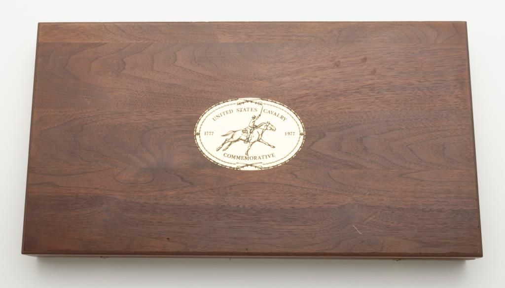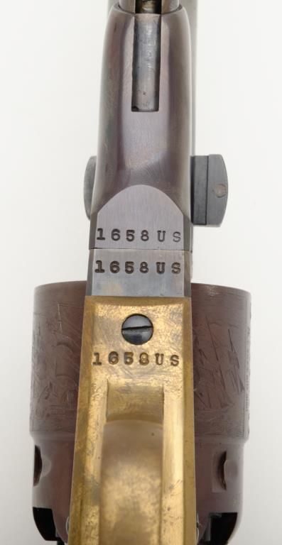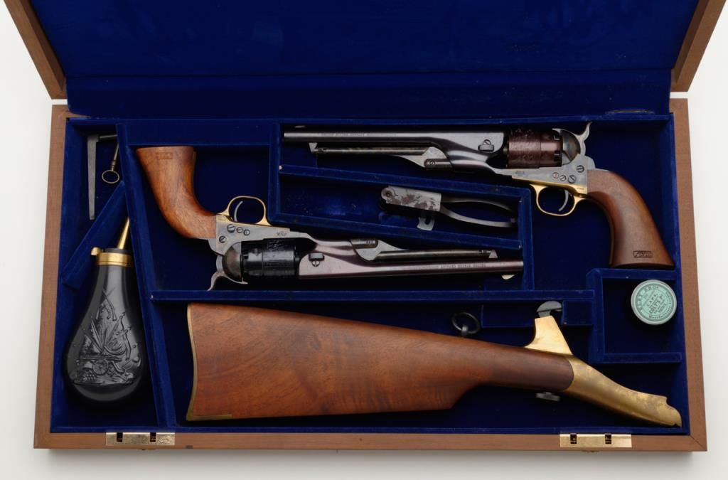 Pair of Colt 1860 Army revolvers with shoulder stock, case and accessories made in the United States, Calvary Commemorative series 1977. Serial numbers 1658US and US1658. The condition is fine to excellent with some slight toning of the finish, minor handling and no evidence of use. 97% and 99% plus. Est.: $900-$1800