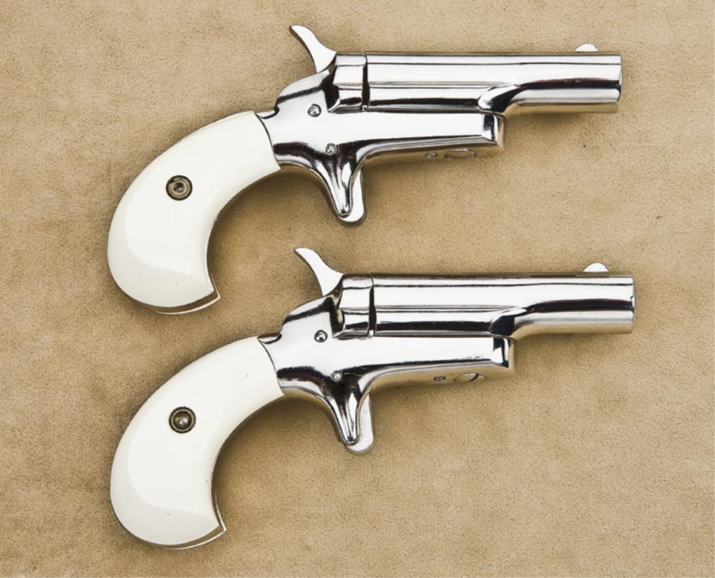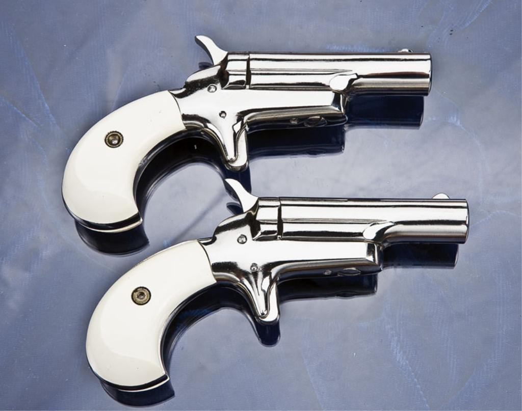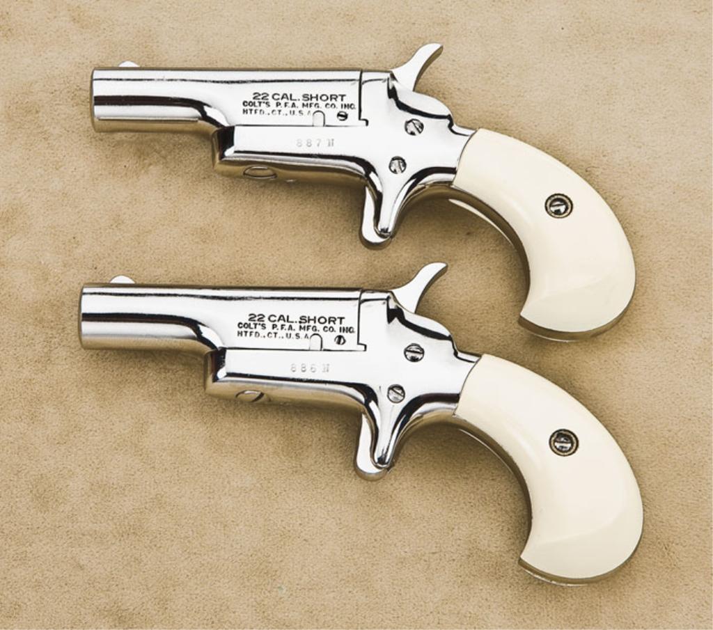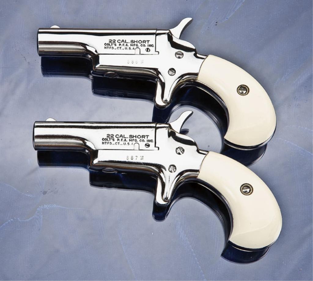 Pair of Colt .22 caliber derringers, factory nickel plated, simulated ivory grips, serial number “887N” and “886N” in custom display case. Est.: $300-$600
