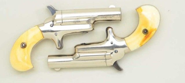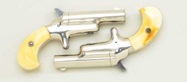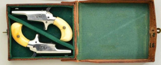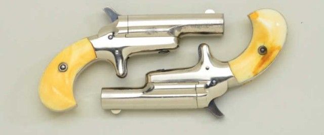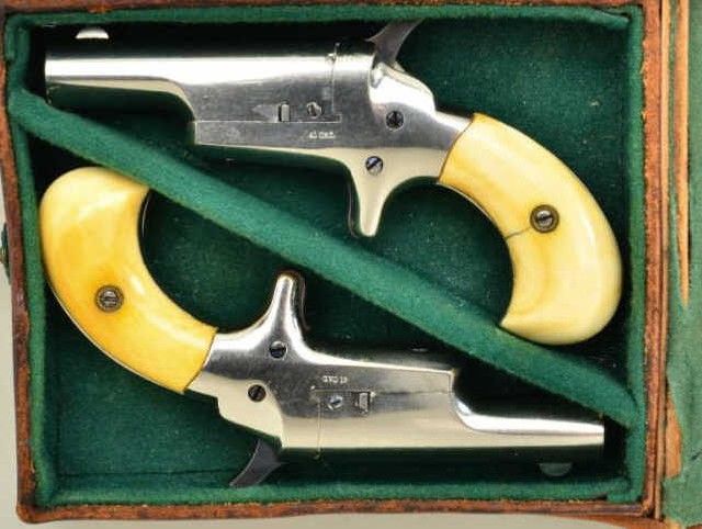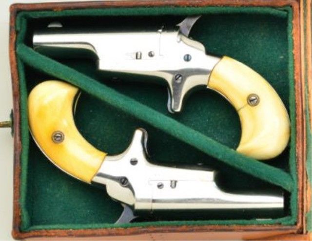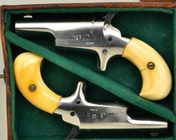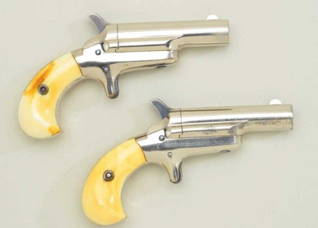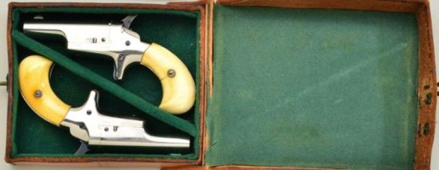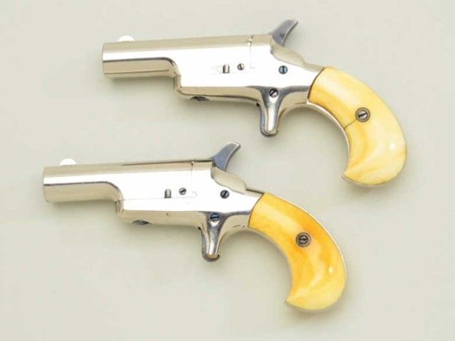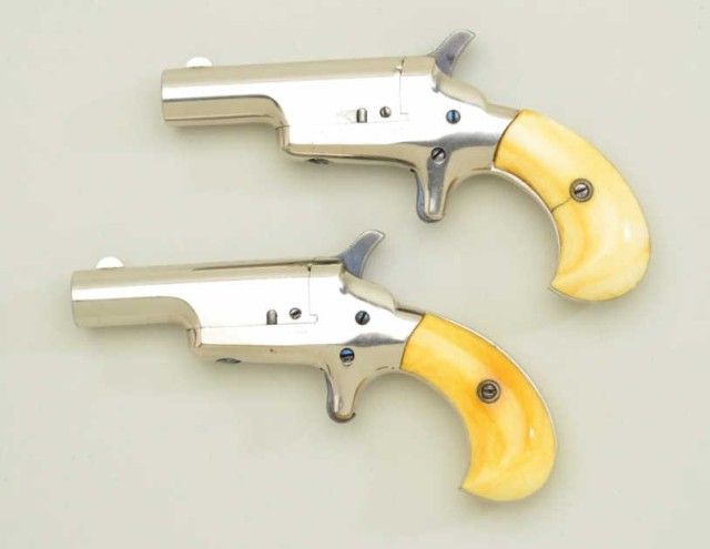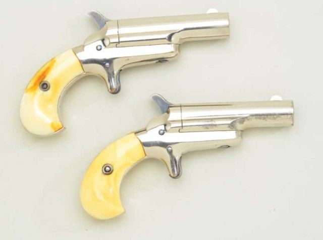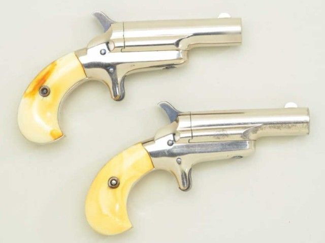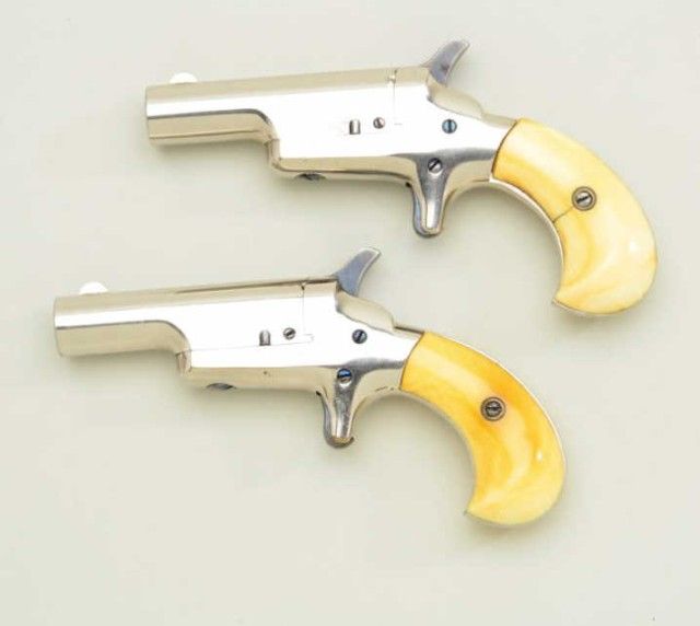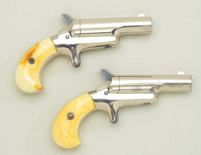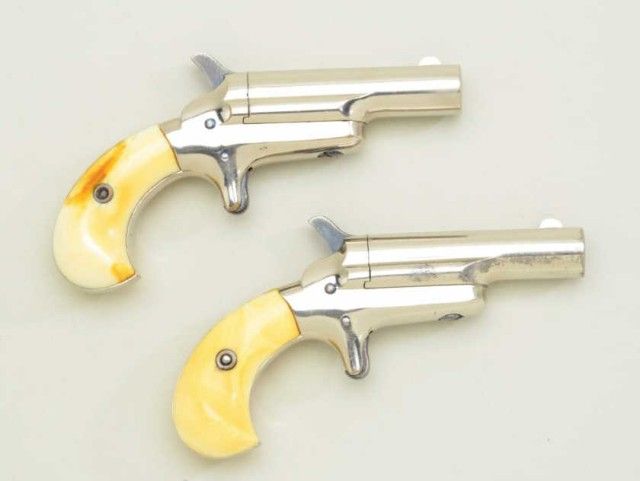 Pair of Colt 3rd Model Derringers in 41 cal rim fire, nickel plated ivory grips with original to the period leather traveling style case, serial #’s 44962 & 44950 (only 12 numbers off and a true pair). The pistolnumbered 44962 shows 90-95% original nickel, slight loss along outside edge, some very minor scratches and no polishing. The metal is sharp and crisp, the hammer shows most of its case hardening, these screws show brightoriginal blue, there is a small mark at the breech from closing with hammer down. The bore is bright and derringer is near excellent with nice patina on minty grips. Pistol number 44950 is in like condition toits mate, slightly better 95-98% nickel, some minor scratches, there is a mark on left side of breech from closing with hammer down, the hammers shows most of its original bright case hardening, bright blue on screws. The grips show a crack on left and normal aging with good patina. The bores on both derringers are bright. The case shows a green felt interior with a leather exterior mounted with a brass hinge and lock
