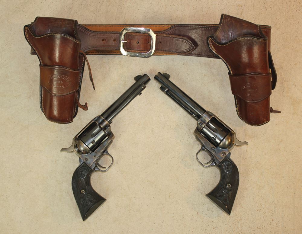 Two matching original Colt single action revolvers, new in box, 3rd generation, 45 cal., and 5 1/2" barrels . With super nice double gun holster marked Tombstone Leather Company. Serial Numbers #S42628A and S42704A.