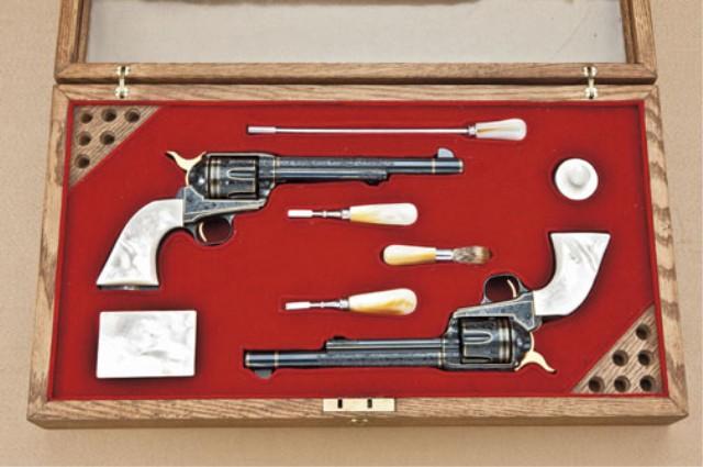 Pair of Colt Single Action army revolvers, .45 caliber, 7-1/2” barrels, full royal blue finish, engraved and flush gold inlaid, pearl grips, with presentation display box and pearl accessories, and glass top for viewing. Serial #98134SA and 98136SA. The pair show large scroll engraving with neatly flush gold inlaid lines and borders and gold-plated hammers. The pistols show the initials J. F. intertwined on the bottom of ejector rod housing who we would judge to be the engraver, who probably accomplished these on special order outside the factory. The pistols are excellent, show no firing or use, since embellishment. A very attractive set, from the Robert Petersen collection. From the Robert Petersen estate. Est: $3,000 - $6,000