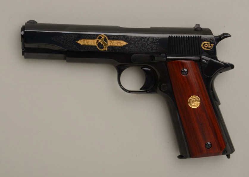Pair of Colt Special Edition Model 1911 .45 cal. autos, with matching serial numbers, #19110045 and #00451911. This edition was marketed as the 100th Anniversary Model, and pistol # 19110045 is listed as a tier 2 grade with royal blue finish engraved slide with gold appointments, select medallion grips and other deluxe treatments. Excellent to new in box with paperwork. Its mate shows a reversed serial number and is a standardgrade tier 3 with black oxide finish, plain slide, checkered 1911 type grips and features. A unique set that was special ordered by noted Texas Colt collector David Tate. Sold as a pair only. Est.:$3,750-$7,500