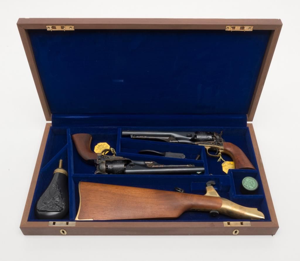 Pair of Colt U.S. Cavalry Commemorative revolvers, .44 cal. percussion; cased with shoulder stock and accessories, #2862US and US2862, near mint condition with tags; no sign of use and very minimal storage and handling; 99%+ condition.Est.: $1,000-$2,000.