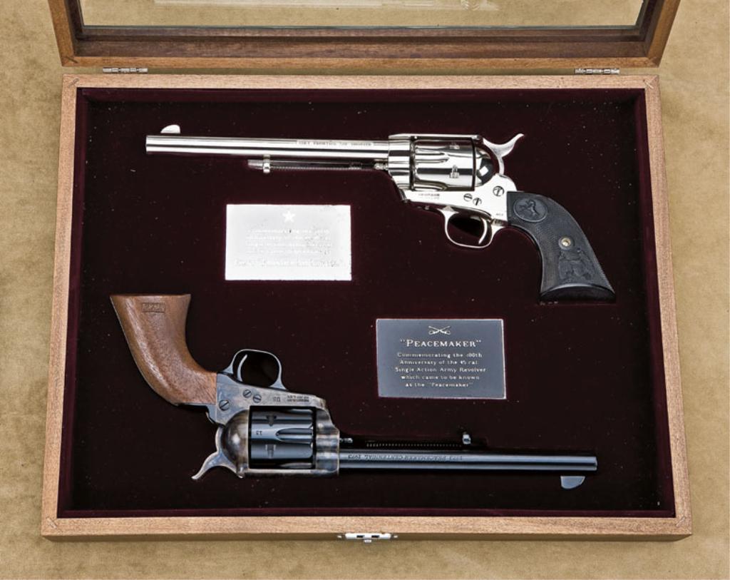 Pair of Colt single action army revolvers, centennial presentation set, serial numbers “13” in the series, consisting of .45 Colt 7-1/2” barrel, U.S. Cavalry marked, with cartouche wood grips, and 19th century features along with matching serial numbered .44-40 single action 7-1/2” etched barrel, nickel plated, with hard rubber grips, in presentation display case with plaques showing dedications. The pistols remain in 99% to new condition, no evidence of firing or use, just some slight storage, with cardboard boxes and shipping box. Provenance: The estate of Ron Kowall, formerly Vice President of BatJac (John Wayne’s production company) to the estate of Michael Wayne (John Wayne’s son), sold by Little John’s Auction Service, November 9th and 10th, 2003, Lot# 794. Est.:$2,500-$5,000