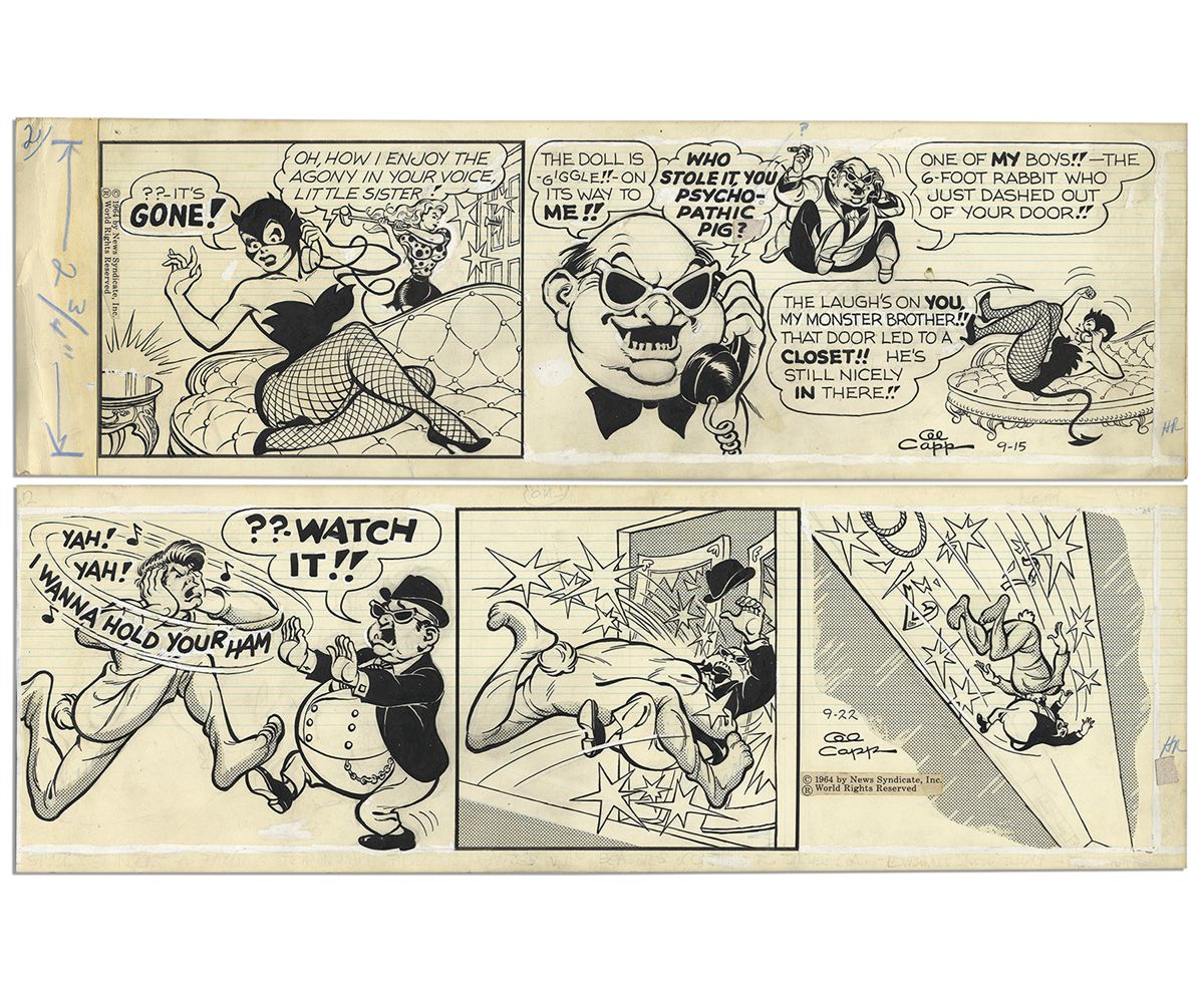 Pair of Comic Strips Drawn & Signed by Al Capp -- 15 & 22 September 1964 -- Featuring Li'l Abner & Daisy Mae -- 19.75'' x 6.25'' -- Toning & White Out, One Is Mounted -- Very Good