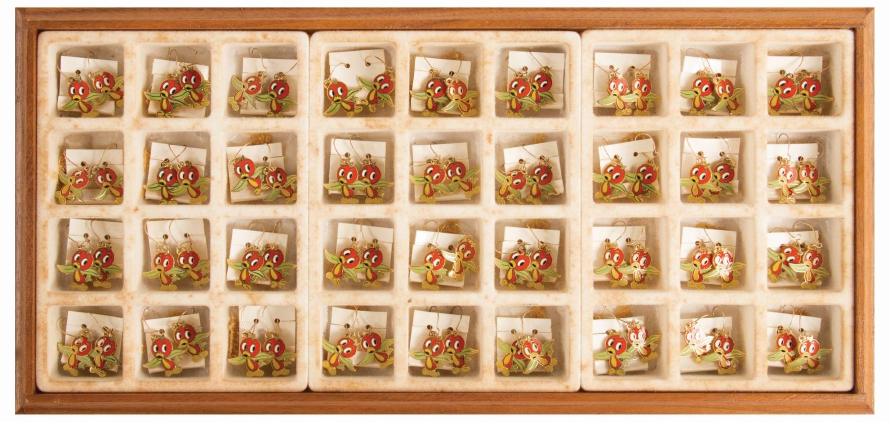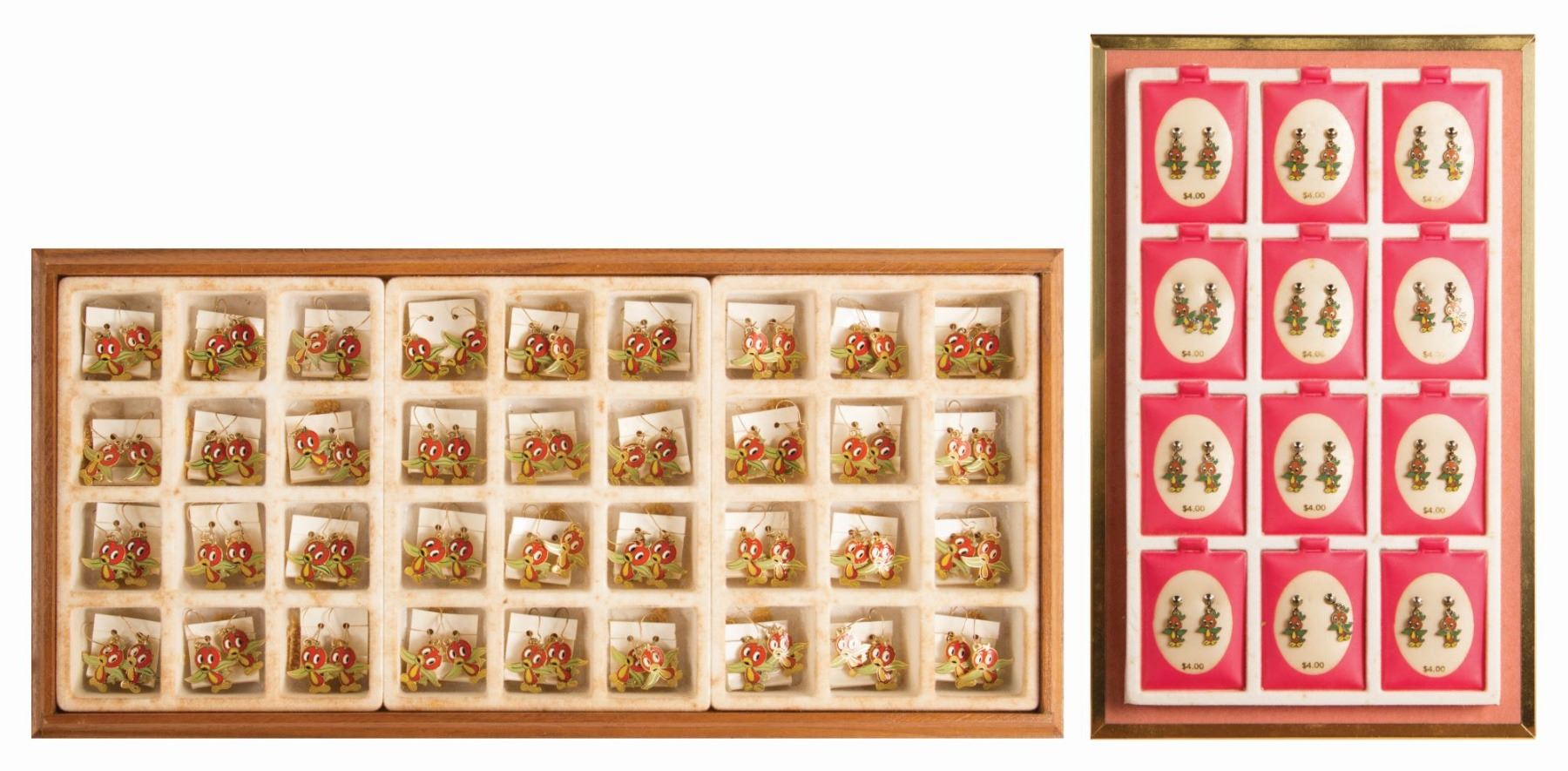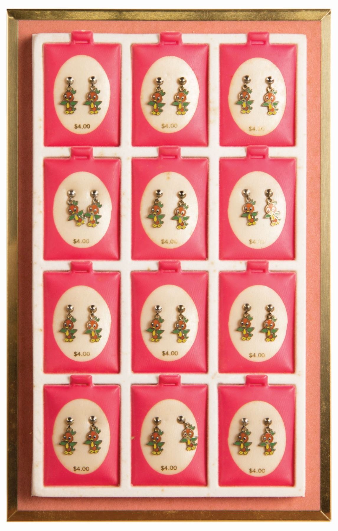 (Walt Disney World, c.1970s) A pair of complete Orange Bird themed store displays including (36) large earrings and (12) small earrings. These stylish souvenirs are a great way to take this popular mascot with you on the go. Measuring approximately 0.75" tall each, the earrings are in good condition overall, with some surface wear from age.