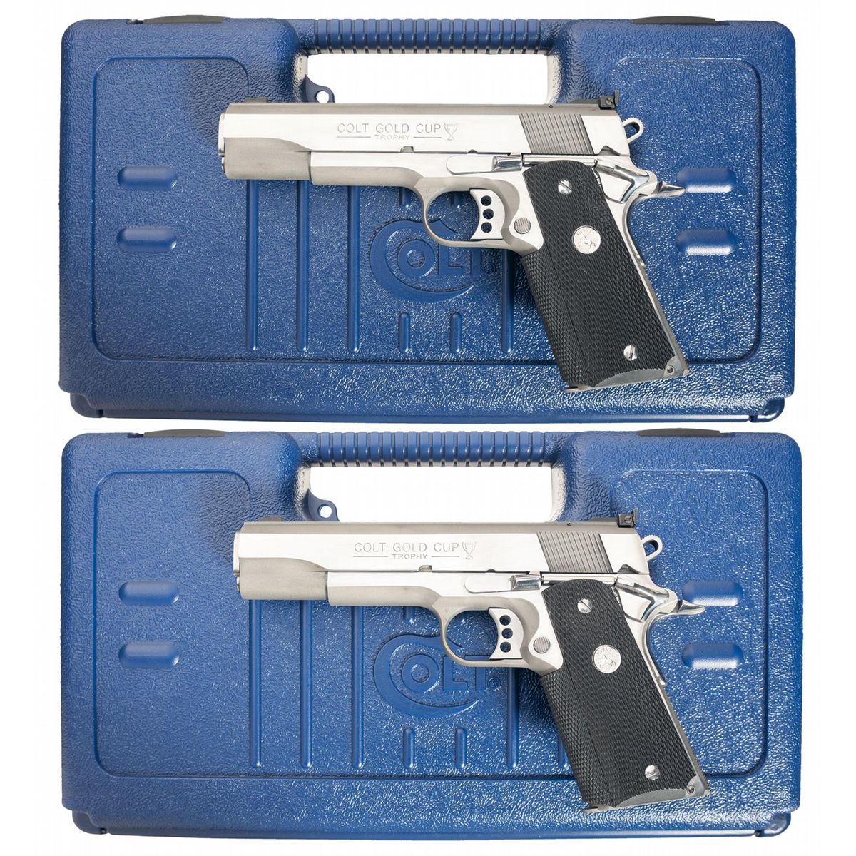 - B) Manufactured in 1997. The slide stop, thumb safety, hammer, magazine release and wide adjustable trigger are all serrated. The flat mainspring housing is checkered. With blue plastic Colt hardcase numbered to gun, 1 extra magazine, 1 extra recoil spring and a bushing wrench.