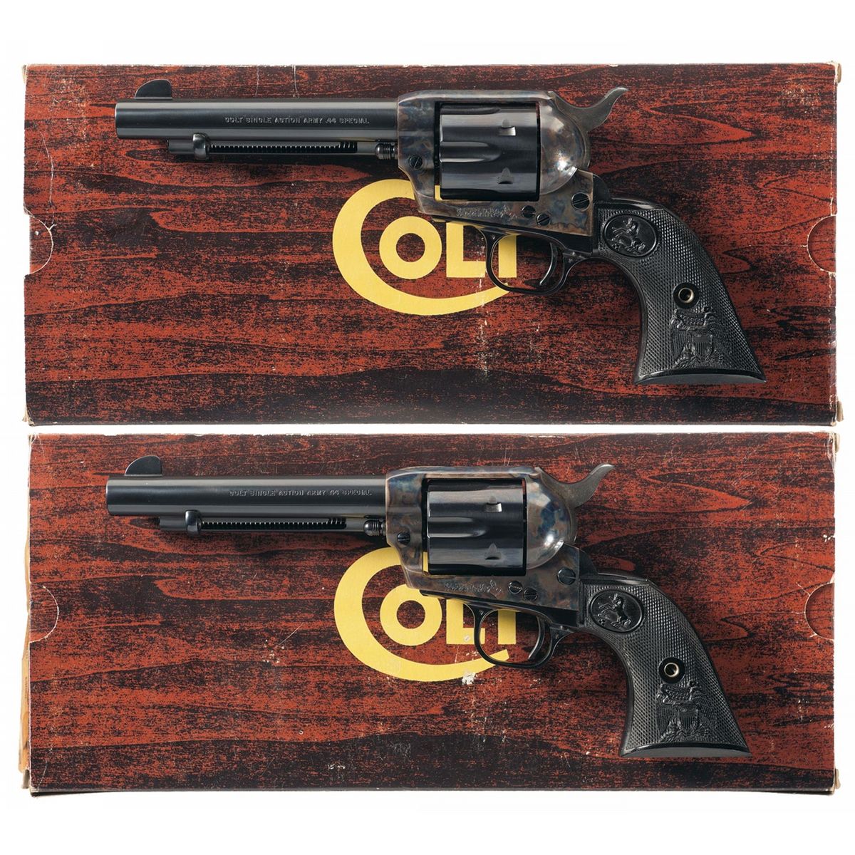 A) Manufactured in 1982. Standard markings and features, consecutive serial number to "B". Fitted with checkered Rampant Colt/American eagle grips. With an original Colt "wood grain" box and manual.