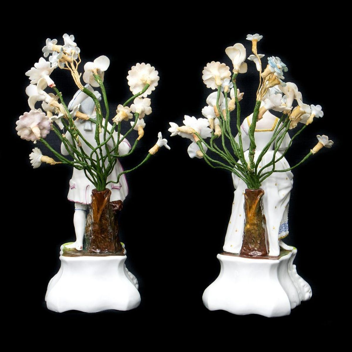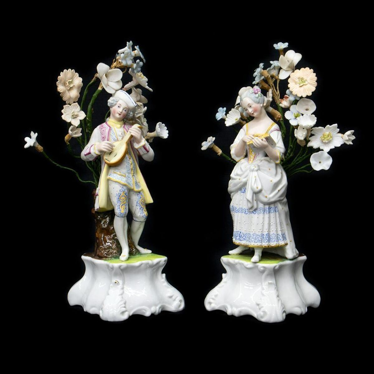 A lady and a gentleman in 18th Century costume, each flanked by floral bouquets en tremblant. 13in. h. Condition: Very good, no chips or cracks.