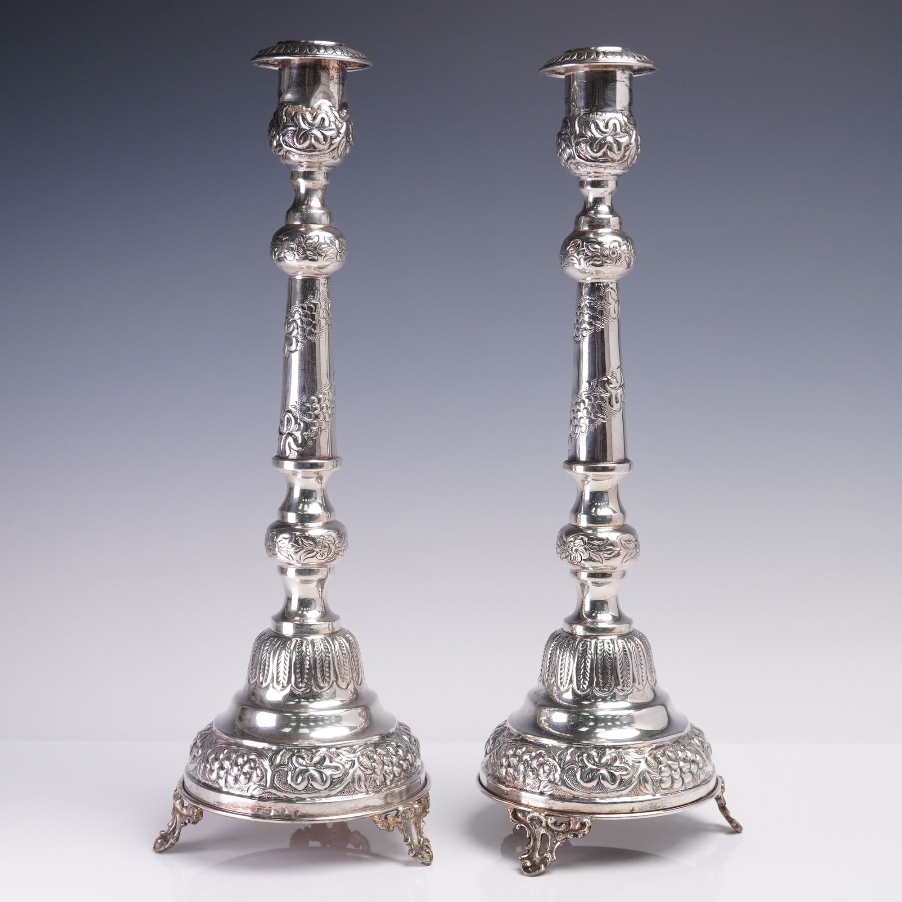A pair of Continental silver table candlesticks, each featuring a tall baluster form and mounted on three scrolled feet. These candlesticks are adorned throughout with raised floral and foliate repousse decorations, including grapes, blossoms, and stylized scrollwork. The upper bobeches are decorated with leaf-tip borders, and the central knops and stems exhibit floral garlands and cross motifs in relief. The bases are domed and heavily ornamented with scrolling grapevine and floral repousse work, set above ornate tri-footed mounts with openwork detailing. The bases show some oxidation and wear consistent with age. The candlesticks are fully hallmarked on the undersides, though the specific marks are partially worn and illegible in areas. Candlestick 1: 9.39 troy oz net silver. Candlestick 2: 9.30 troy oz net silver.
