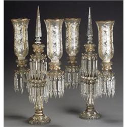 Pair of Continental White and Gilt Decorated Glass Three-Light Lustre Candelabra