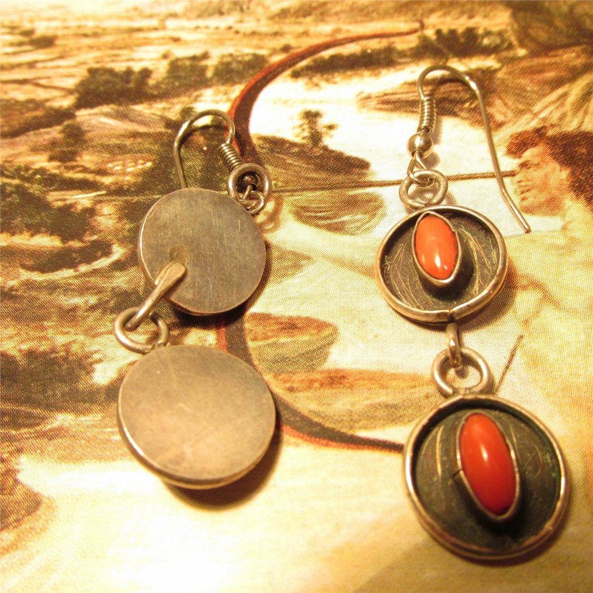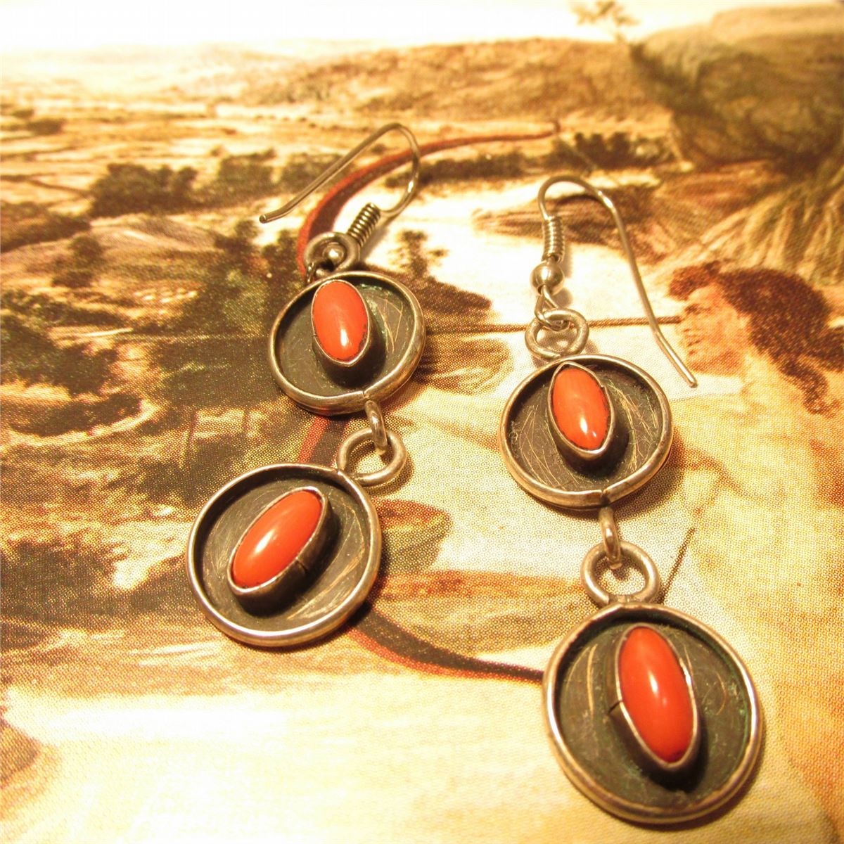 Pair of Coral Dangle Silver Earrings. Zuni Style.