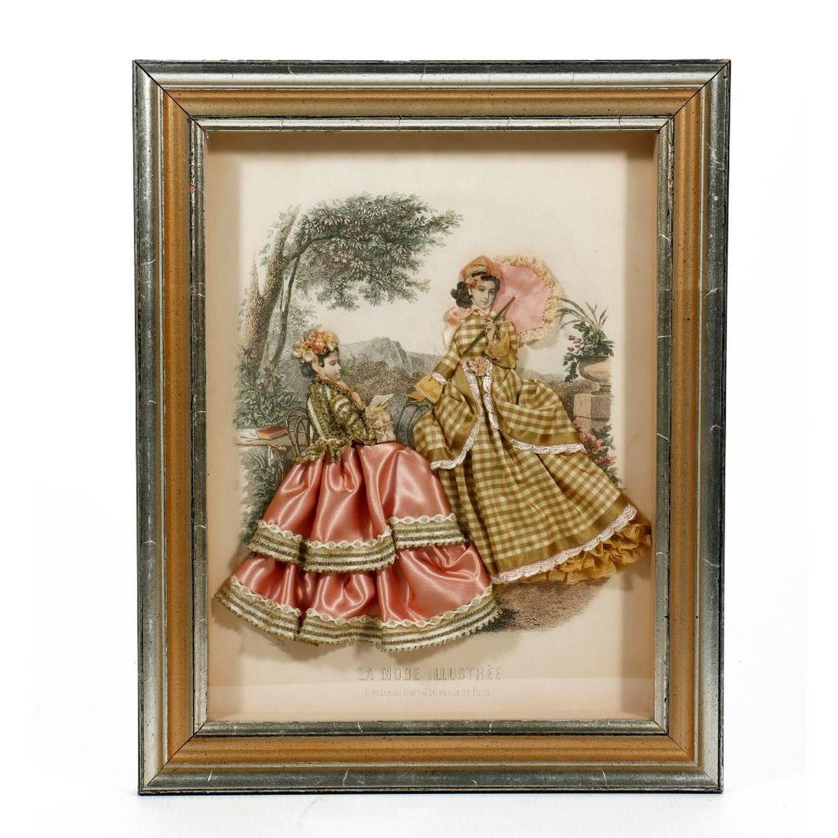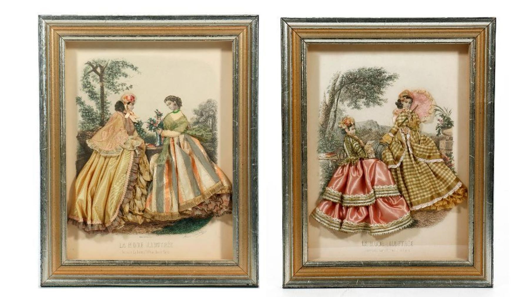 Artist: Unknown. Title/Subject: French costume prints with added green and pink fabric work (a pair). Size: Each 15 1/4in x 12 1/2in. Year Created: 20th century. Signature: Unsigned. Medium/Ground: Mixed media in shadowbox frames. Condition: Good. Condition Report: All lots are sold as is and where is. Turner Auctions + Appraisals, LLC provides condition reports upon request to aid in your bidding decision. No statement regarding age, condition, kind, value, or quality of a lot, whether made orally at the auction or at any other time, or in writing in this catalog or elsewhere, shall be construed to be an express or implied warranty, representation, or assumption of liability. All sales are final, Turner Auctions + Appraisals, LLC does not give refunds based on condition. Turner Auctions + Appraisals, LLC does not perform any shipping or packing services. We do have a list of suggested shippers who gladly provide quotes prior to your bidding. Please visit our webpage for a list of recommended shippers.