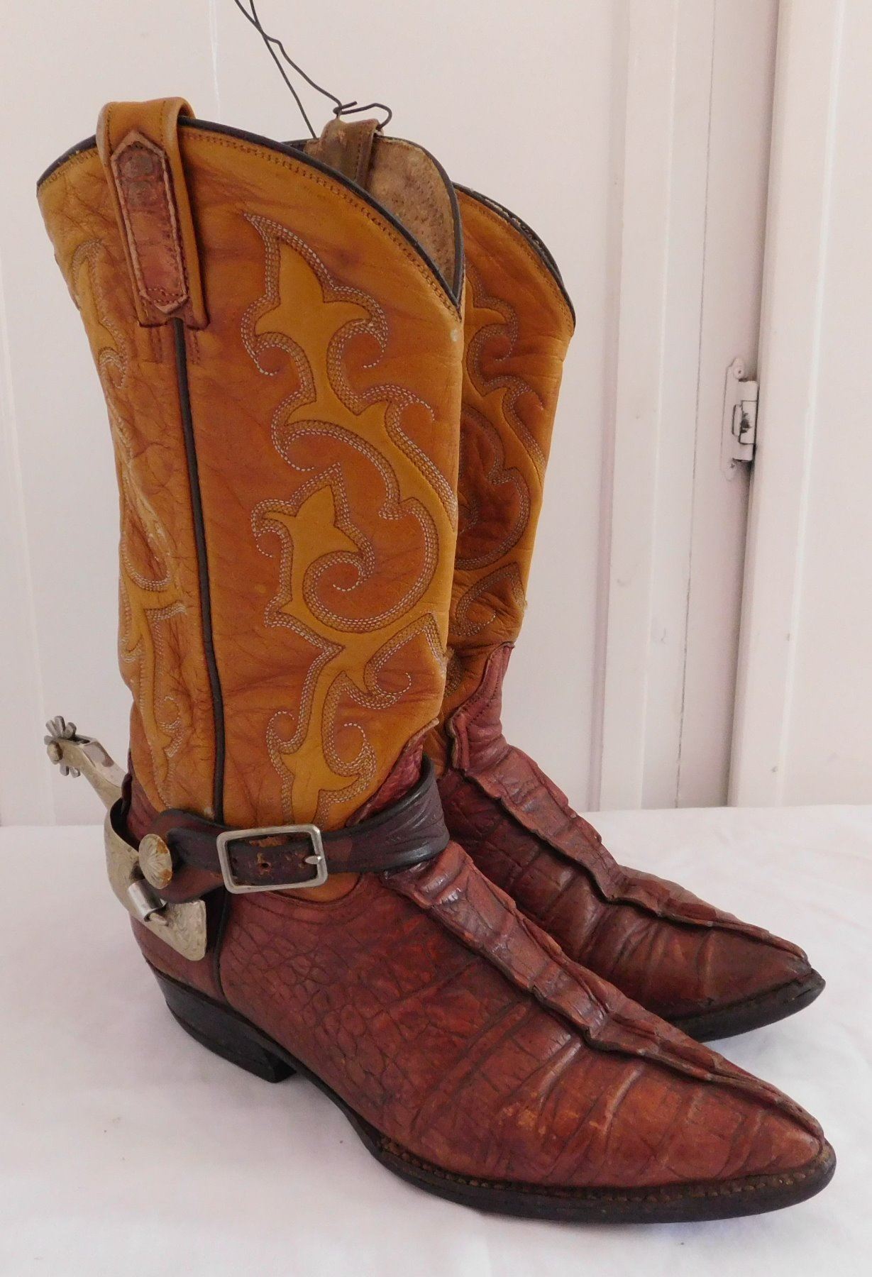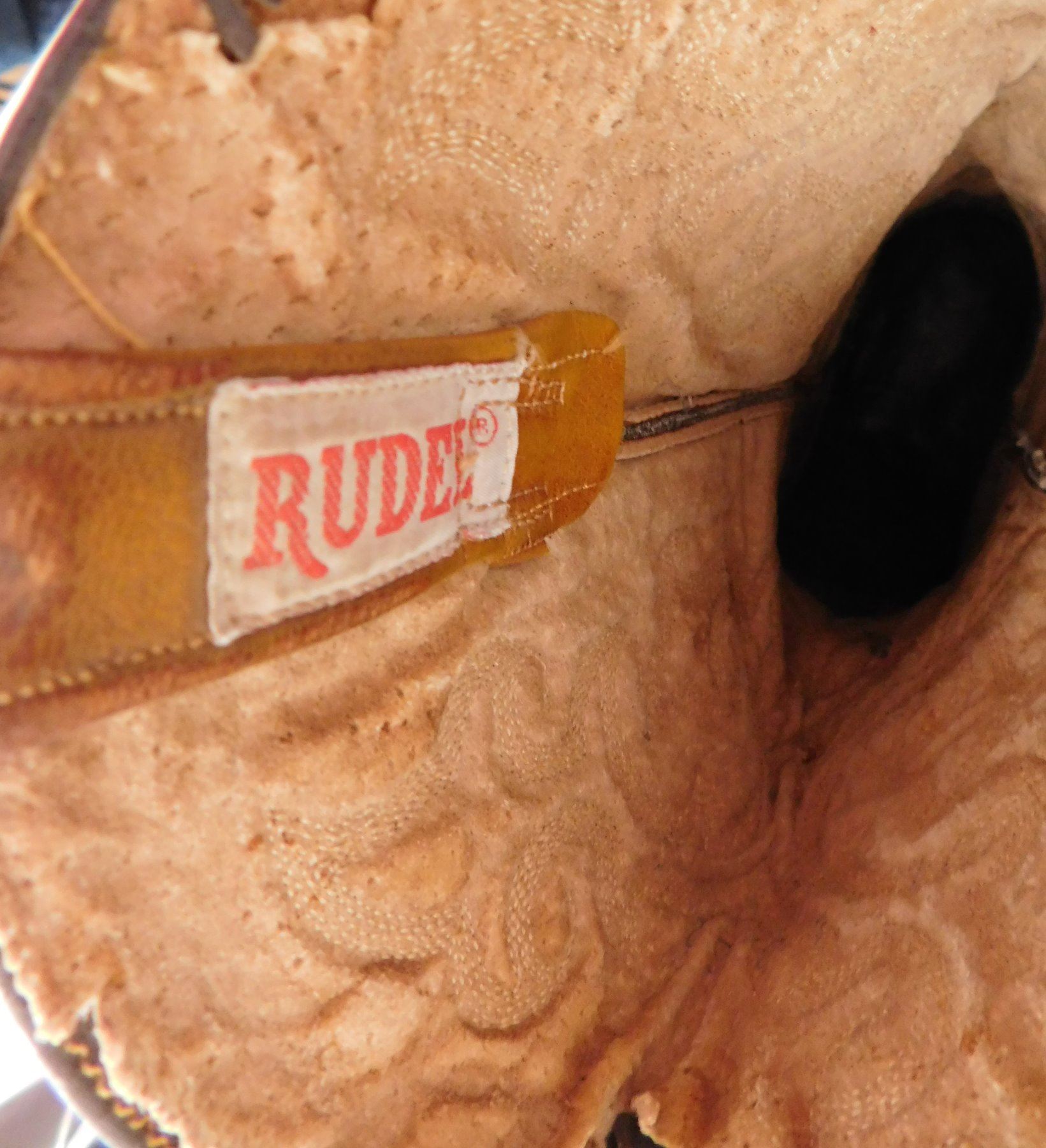 Pair of Cowboy Boots, circa 1970s. Made of leather and metal spur, the items measure about 3.75" x 11.25" x 14" tall each. Rudel brand. No sizing information, probably size 9. Condition: Only one spur, see images. Shipping: $26.50 w/insurance and signature, due to size.