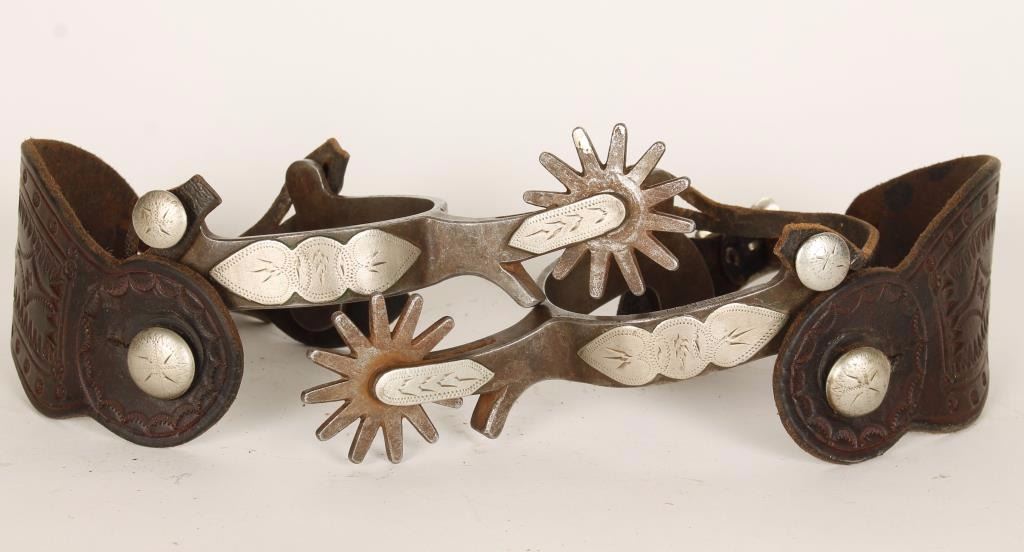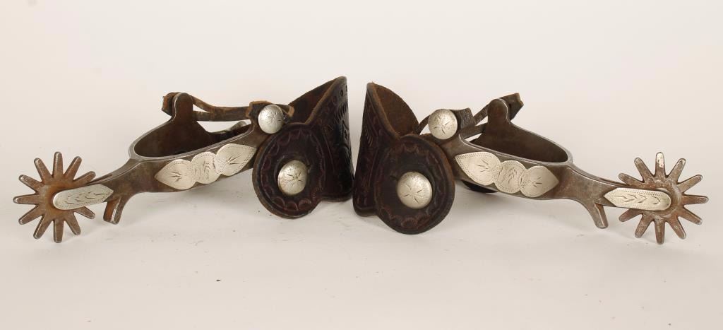 Marked, Overlaid Texas Spurs, Split heel band, Tooled leather Spurs marked 'AP Henry SD'.