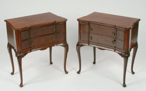 Pair of Crossbanded Walnut Two Drawer Side Tables in the early 18th Century manner, on slender carve