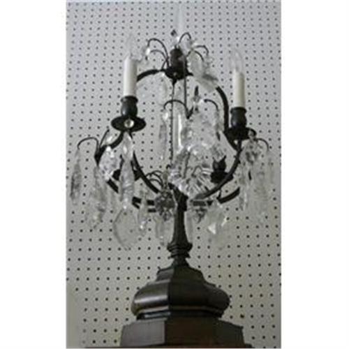 Pair of wonderful patinated metal and crystal candleabra with four lights each. The base measures 8" Diameter. They are wired for USA use and make a great addition to any setting.