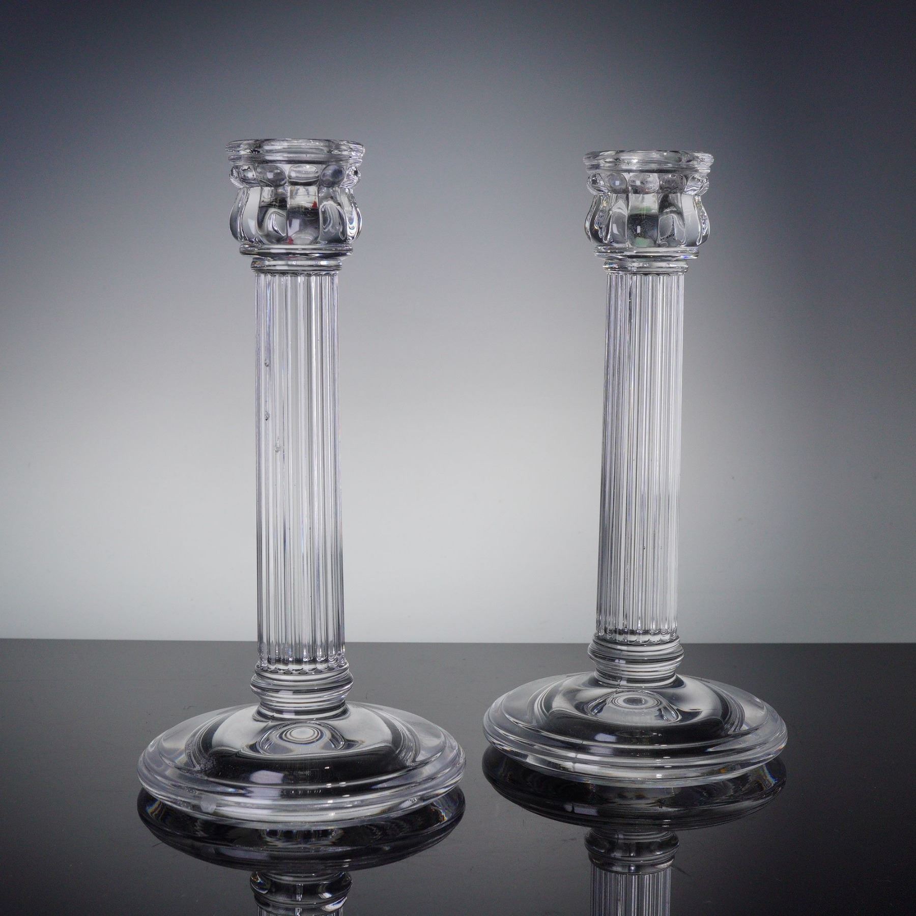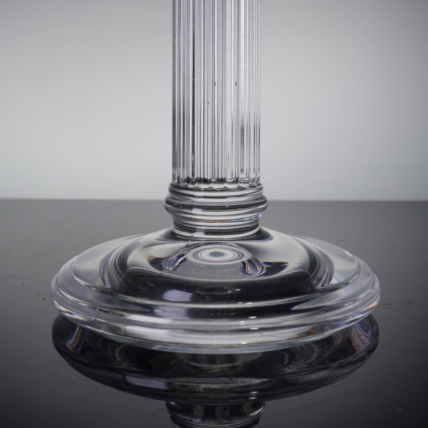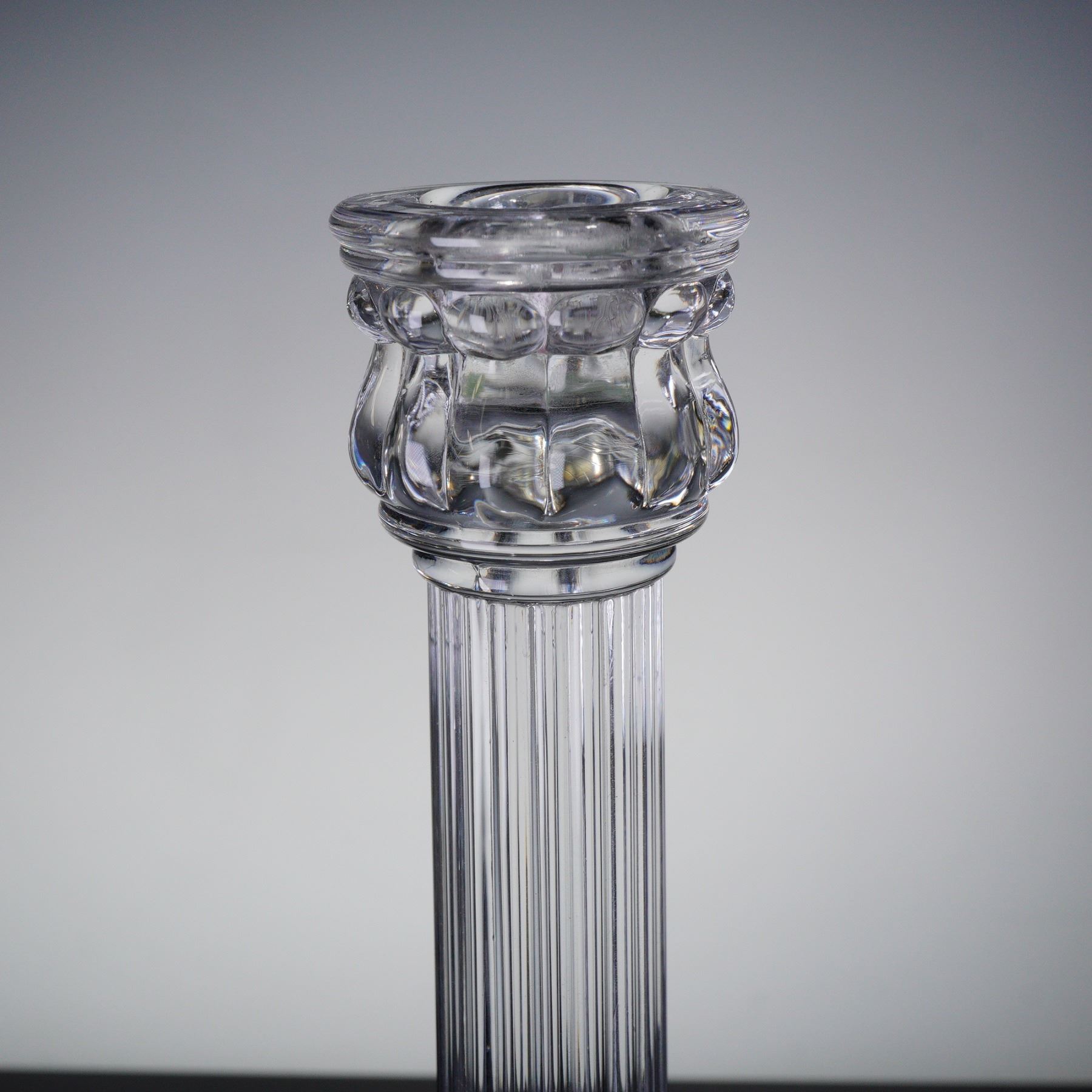 This elegant pair of crystal candle holders features a refined columnar form inspired by classical architecture. Each piece is crafted from clear cut glass, the stems fluted vertically to catch and reflect the light with understated brilliance. The circular bases are weighty and domed for stability, finished with a finely cut starburst pattern at the center. The capitals are intricately molded with rounded lobes and a defined lip, designed to hold taper candles securely. Viewed from above, the symmetrical precision and radial detail of the cutting are especially striking, showcasing the skill and balance of their craftsmanship.